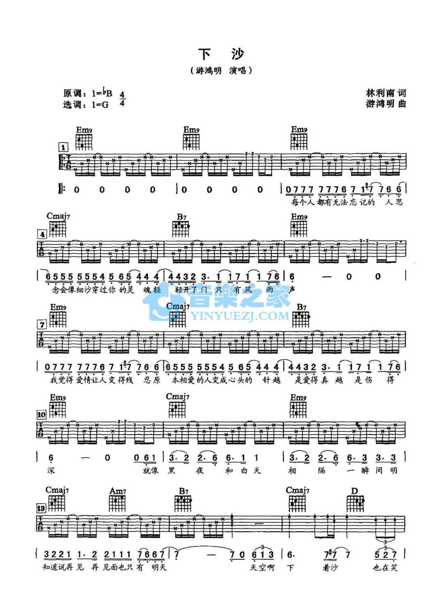 曲谱介绍: G调版游鸿明《下沙》吉他弹唱六线谱