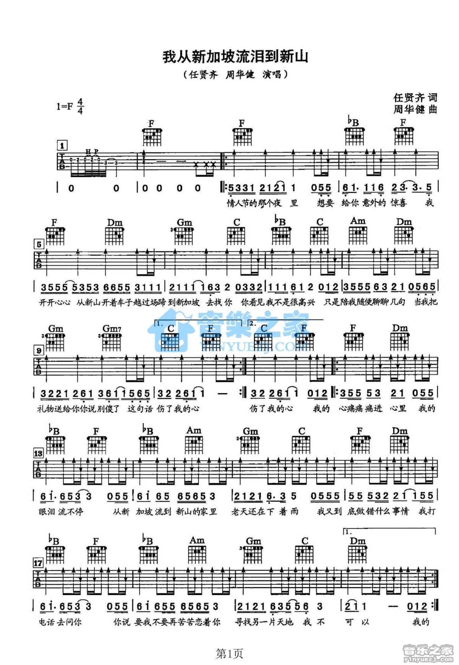曲谱介绍: F调版任贤齐/周华健《我从新加坡流泪到新山》吉他弹唱六线谱