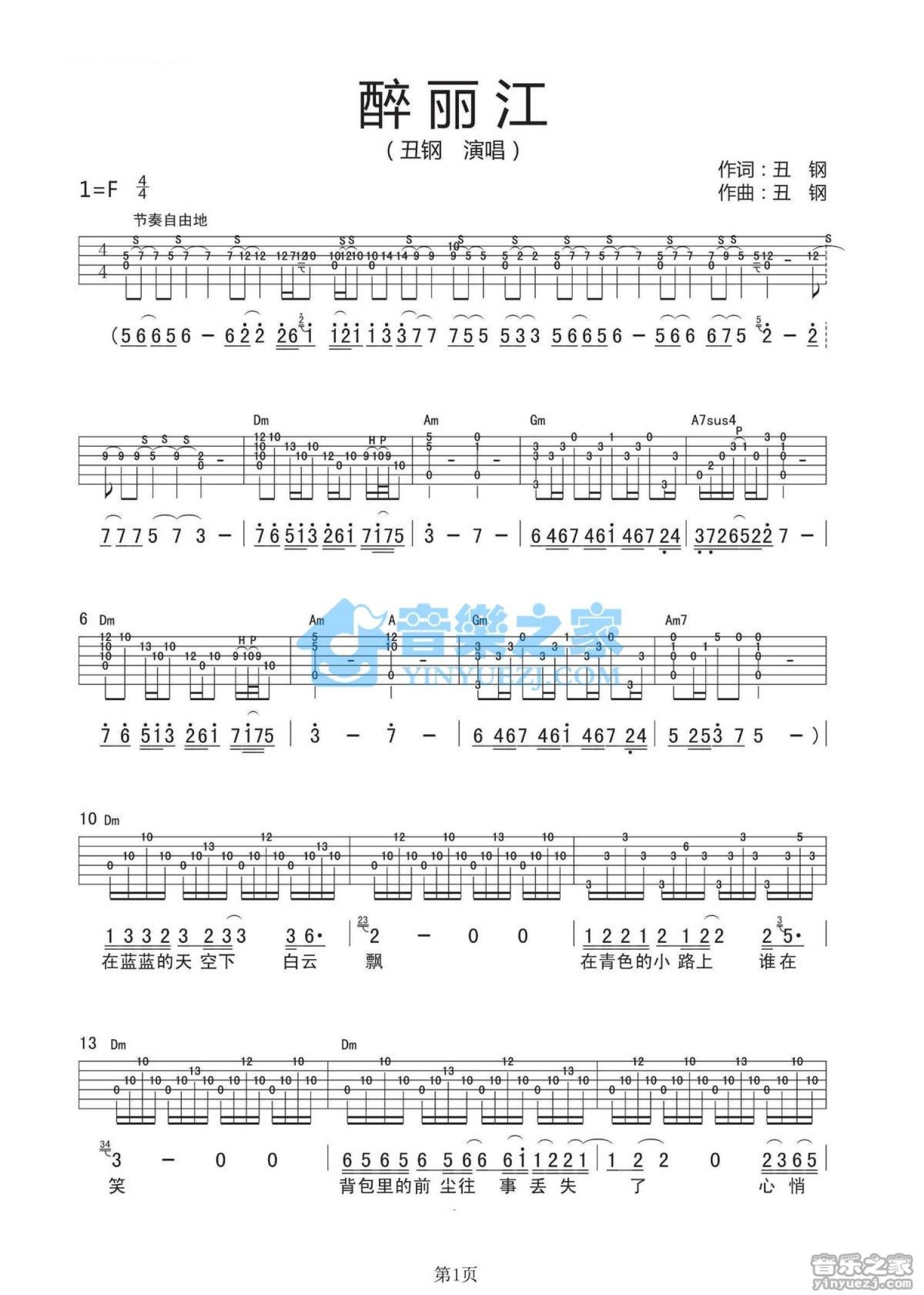曲谱介绍: 丽江酒吧F调原版丑钢《醉丽江》吉他弹唱六线谱