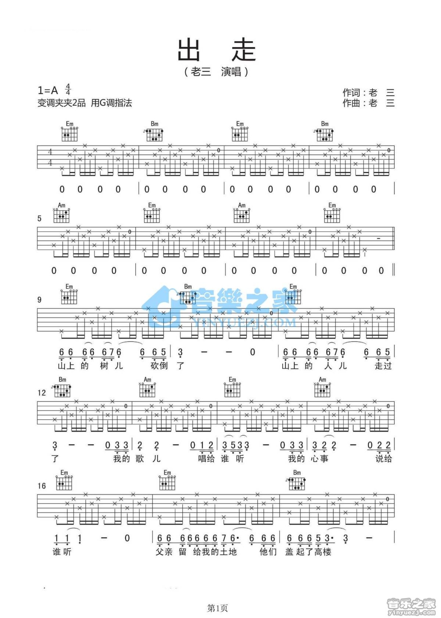 出走吉他谱 - 老三 - G调吉他弹唱谱