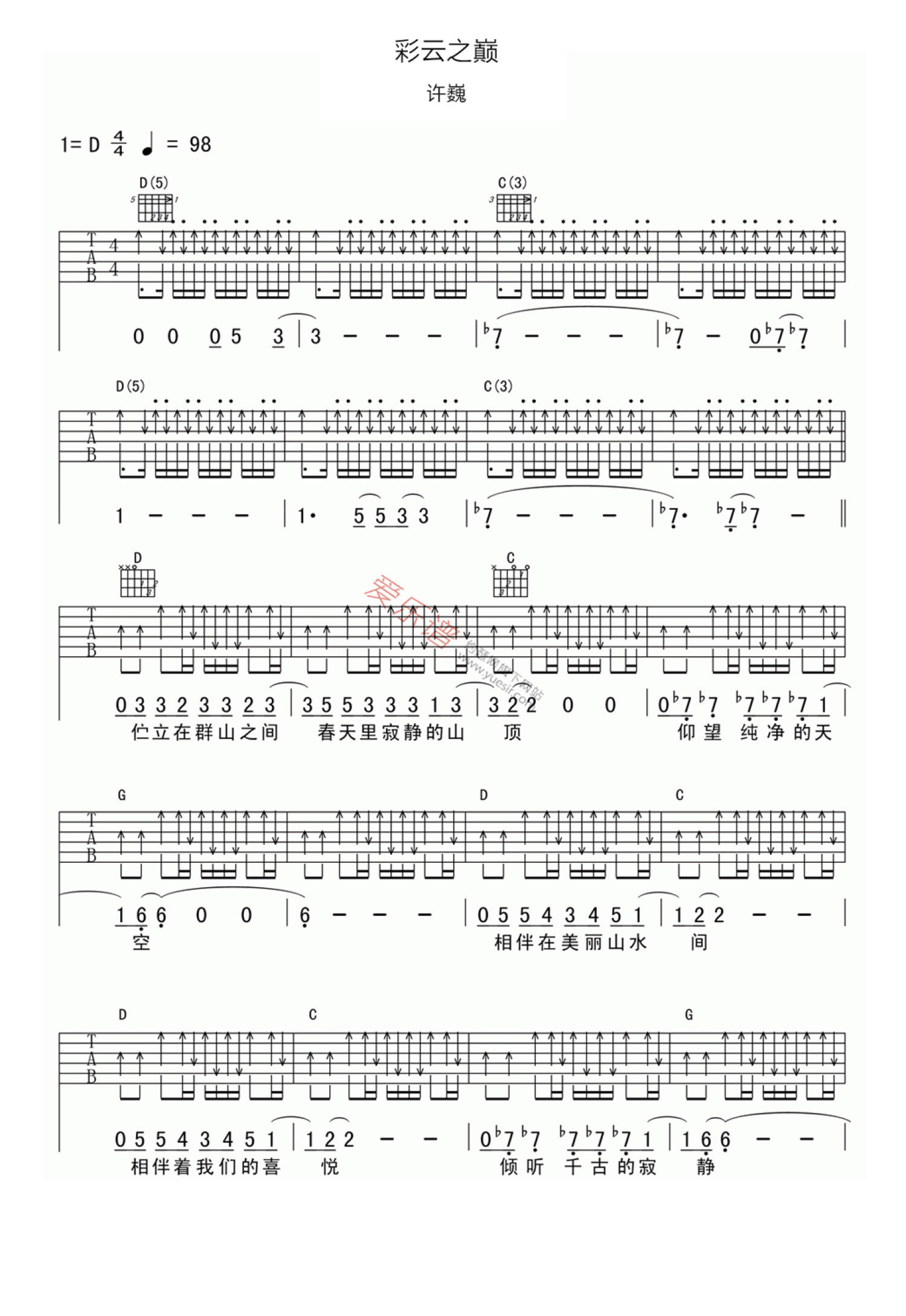彩云之巅吉他谱 - 许巍 - D调吉他弹唱谱