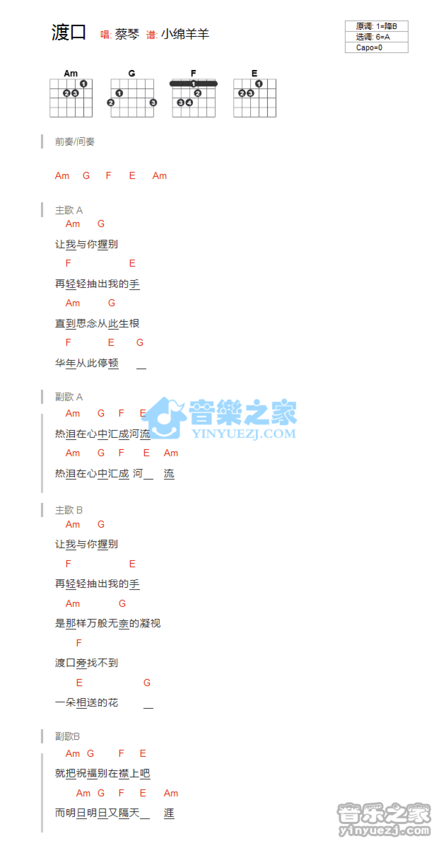 曲谱介绍: A调版蔡琴《渡口》吉他和弦弹唱谱