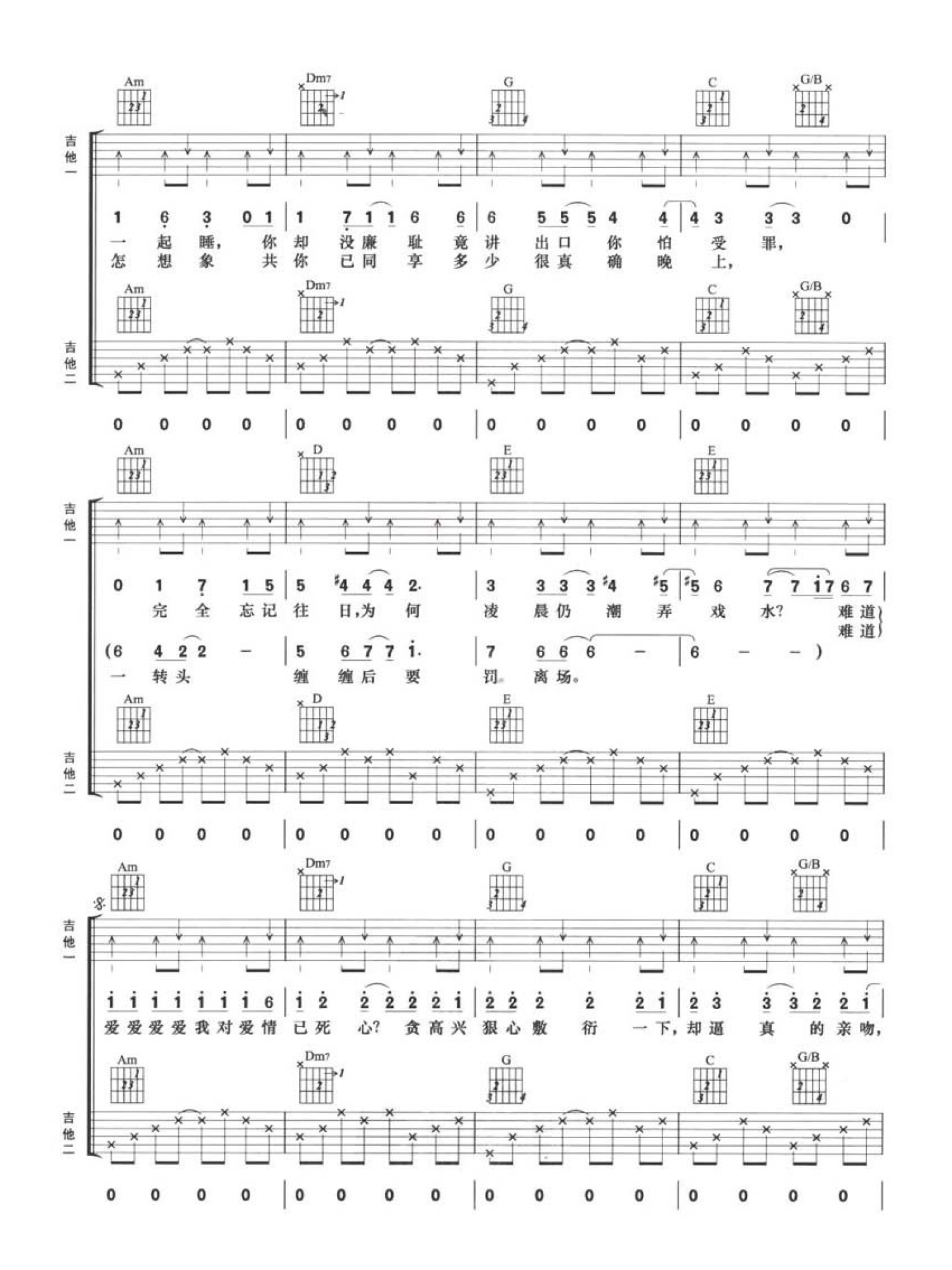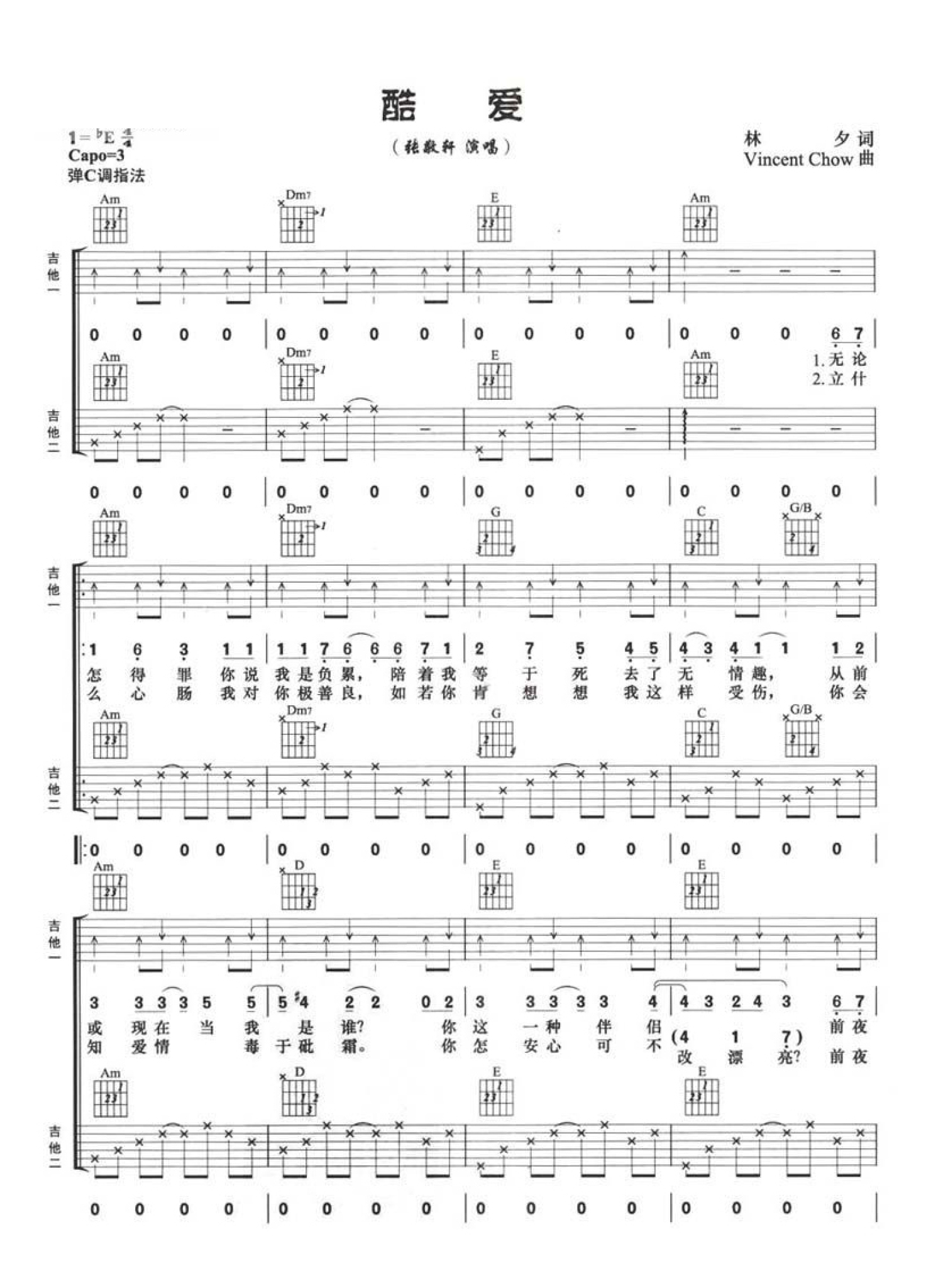曲谱介绍: C调版张敬轩《酷爱》吉他和弦弹唱谱