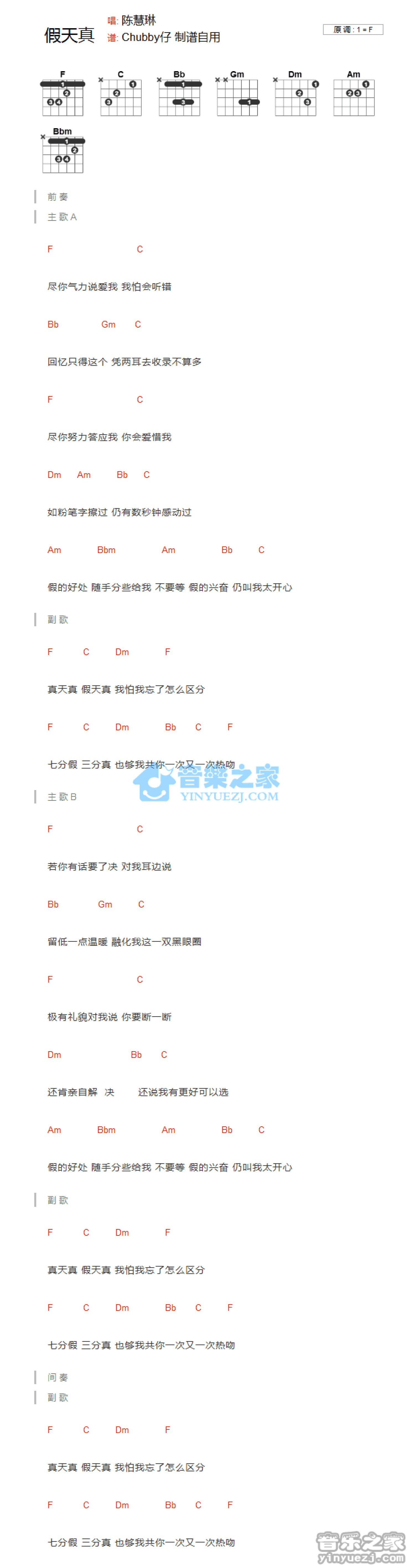 曲谱介绍: F调版陈慧琳《假天真》吉他和弦弹唱谱