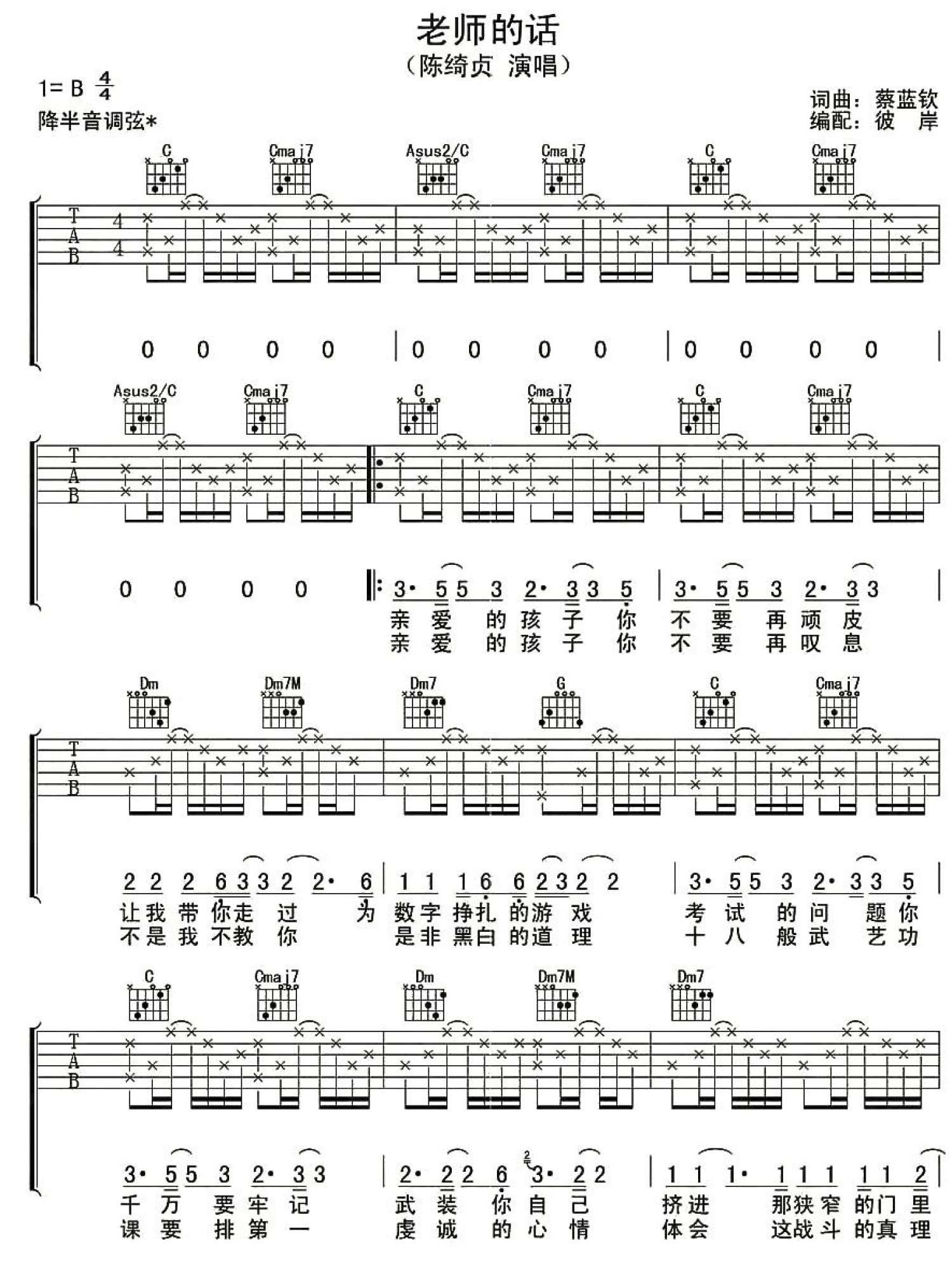 曲谱介绍: 陈绮贞老师的话吉他谱,原曲吉他采用了降半音调弦,变调夹夹一品,这样实际也就是降B调,琴友们也可以直接使用降半音调弦,不用变调夹用C调指法弹,出来也是B调,当然如果直接用标准调弦来唱也可以。台湾早逝歌手蔡蓝钦的一首老歌,老师的话吉他弹唱谱。