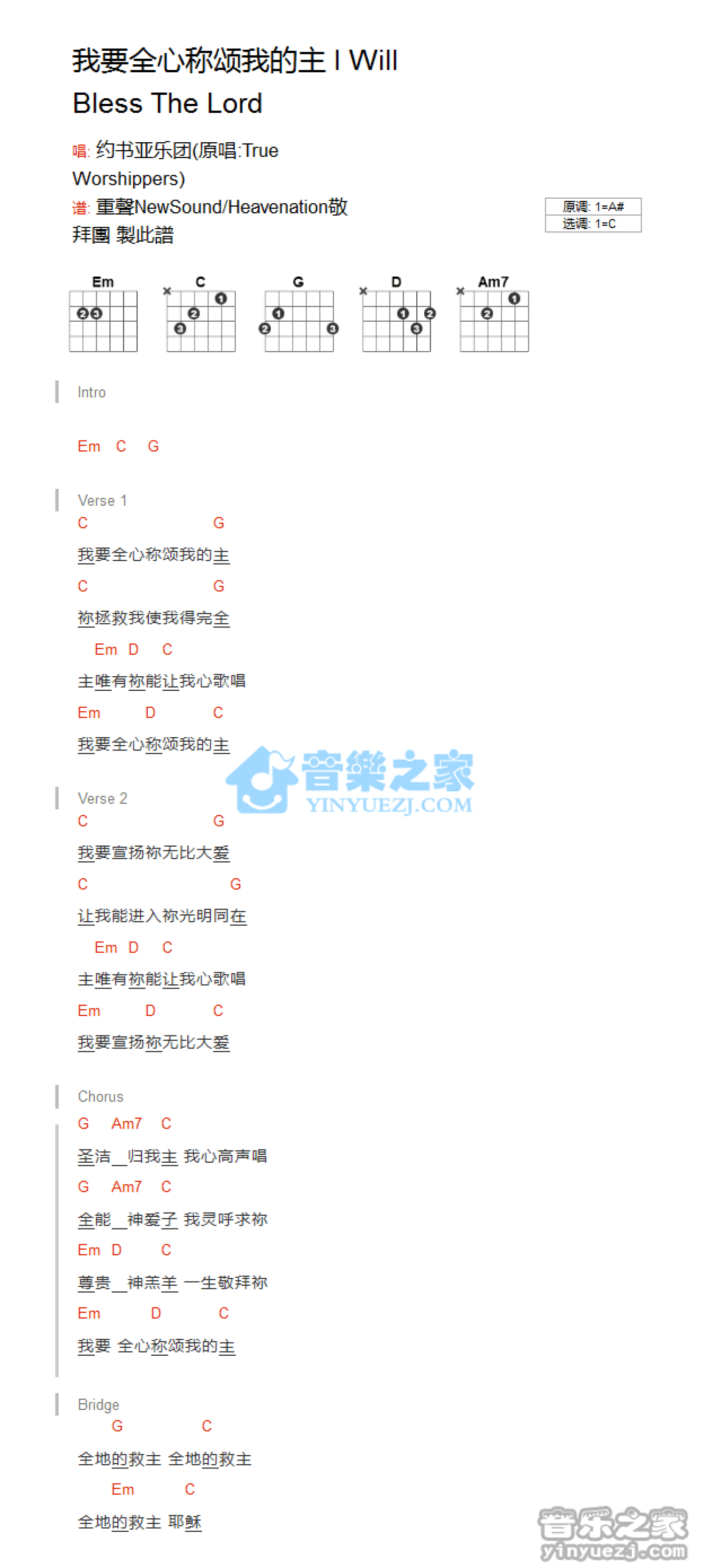曲谱介绍: C调版约书亚《我要全心称颂我的主》吉他和弦弹唱谱