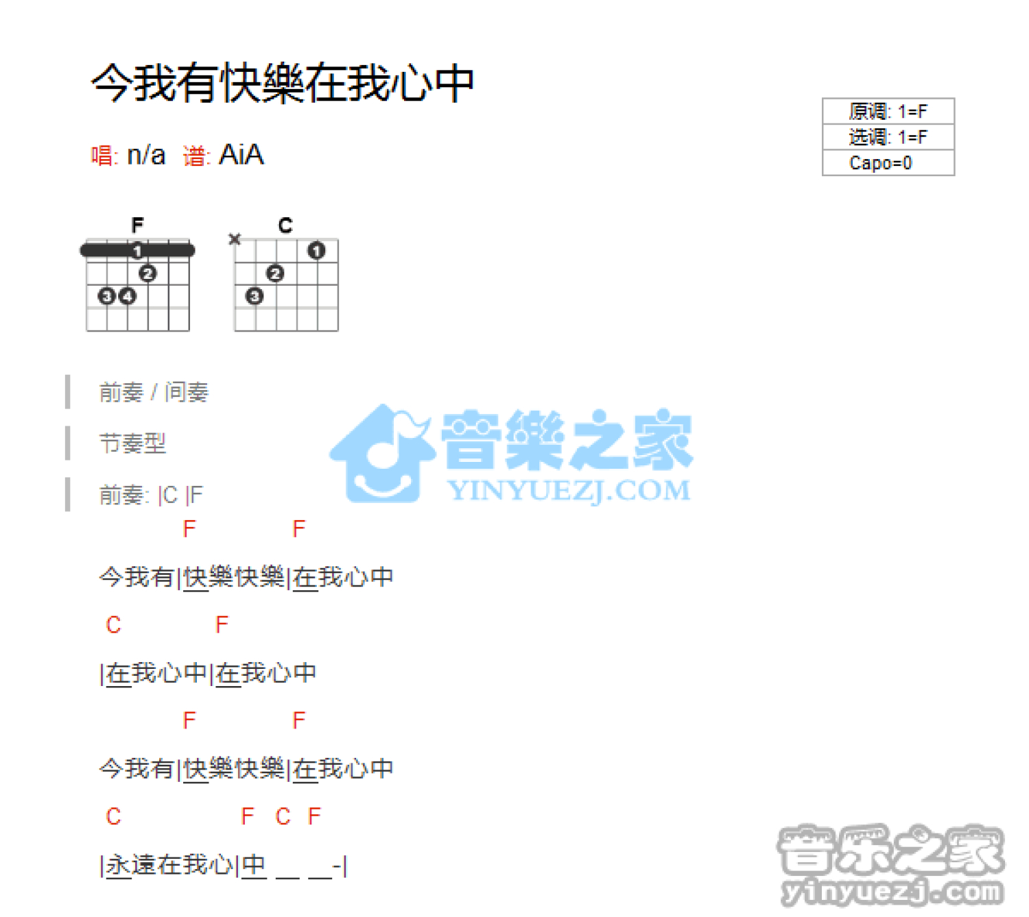 曲谱介绍: F调版儿歌《今我有快乐》吉他和弦弹唱谱