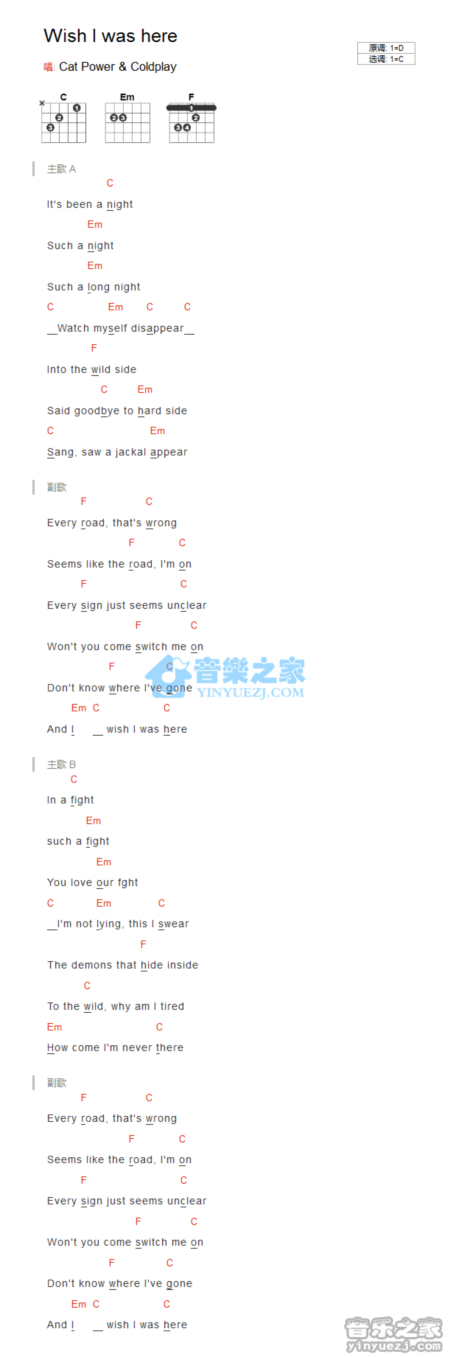 曲谱介绍: C调版CatPower《WishIWasHere》吉他和弦弹唱谱