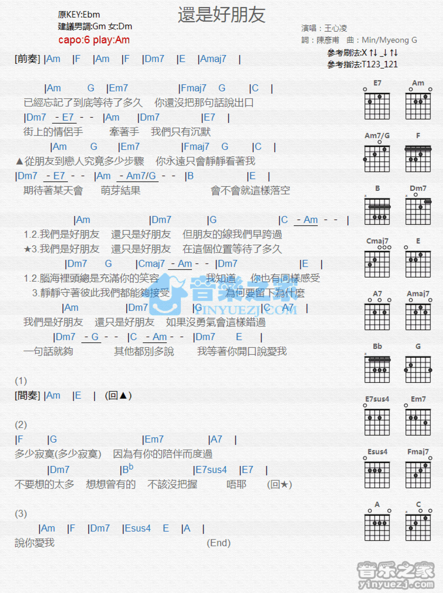 曲谱介绍: Am调版王心凌《还是好朋友》吉他和弦弹唱谱