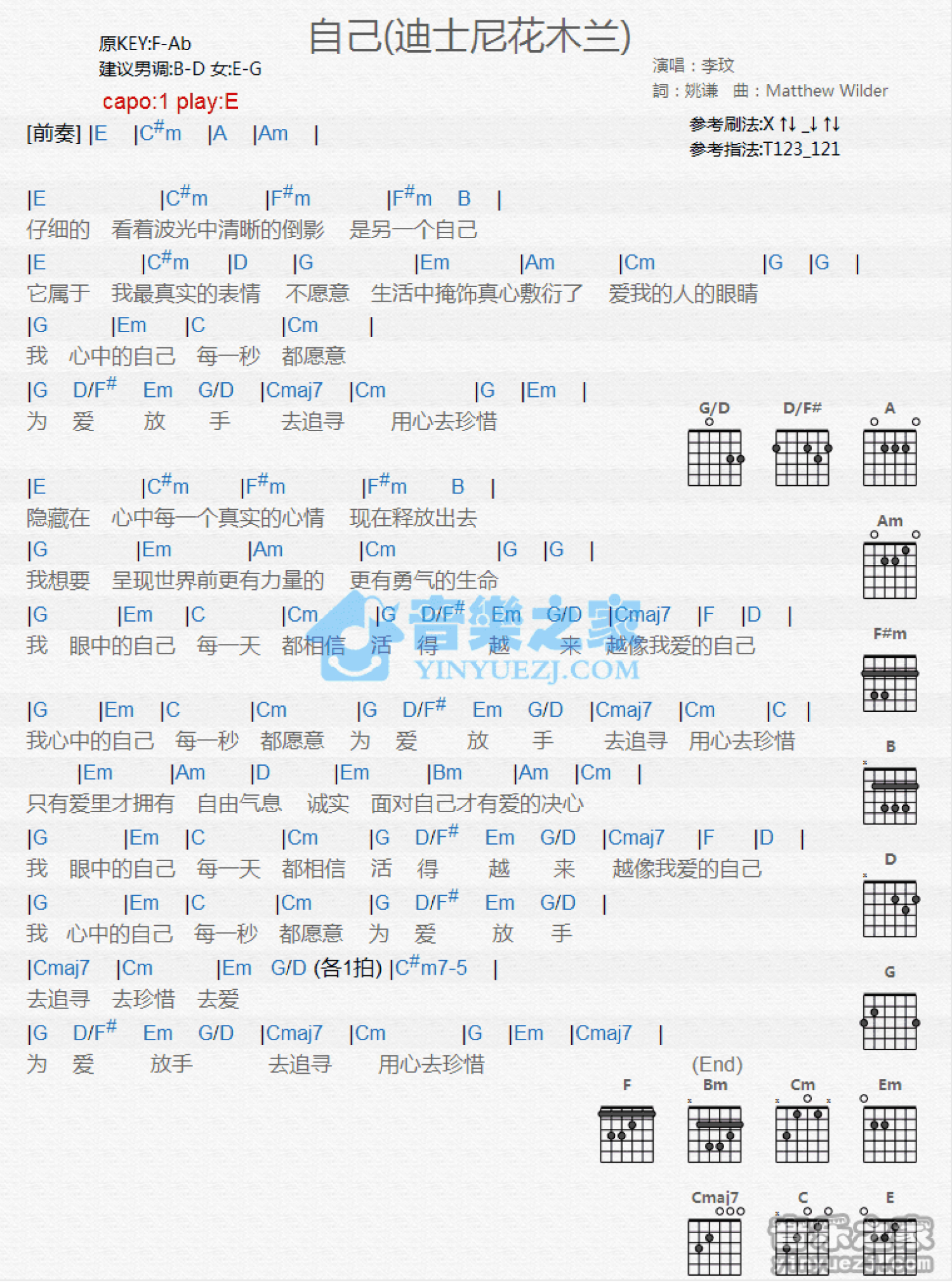曲谱介绍: E调版李玟《自己》吉他和弦弹唱谱迪斯尼花木兰中文主题曲