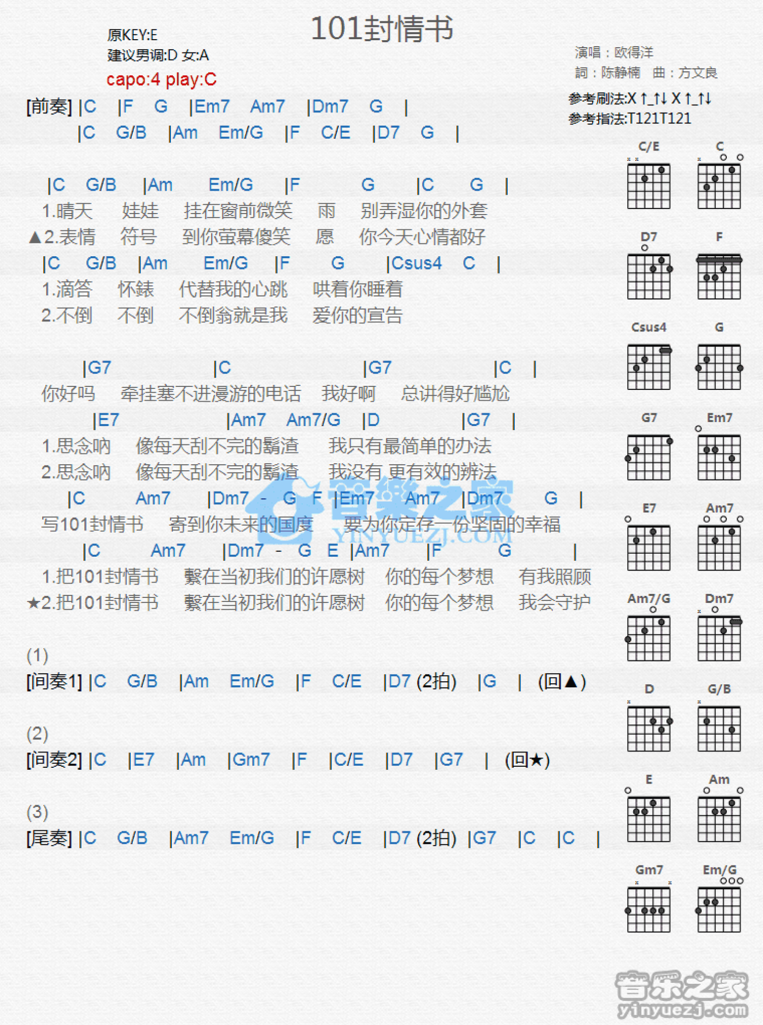 曲谱介绍: C调版欧得洋《101封情书》吉他和弦弹唱谱
