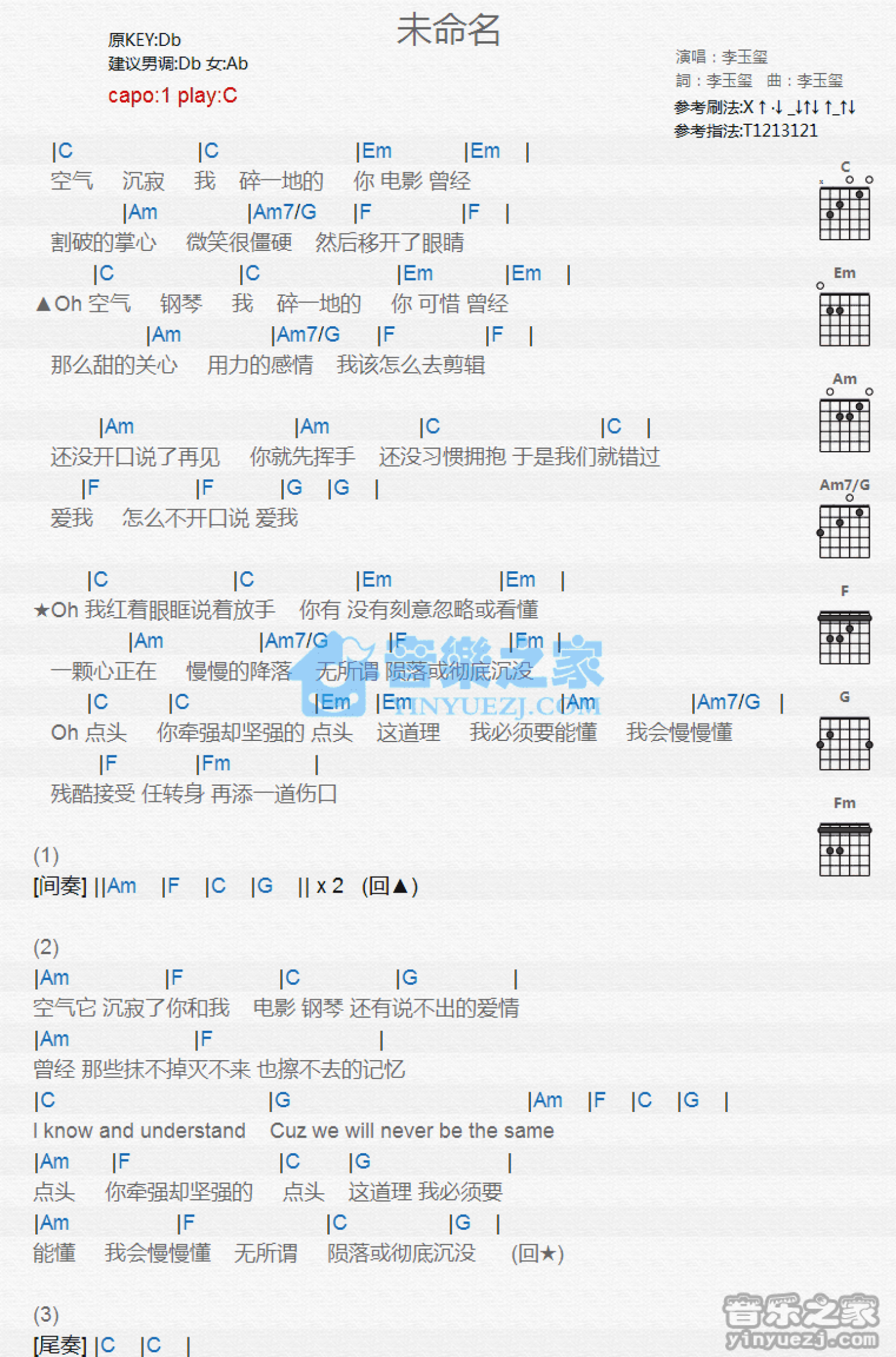 曲谱介绍: C调版李玉玺《未命名》吉他和弦弹唱谱