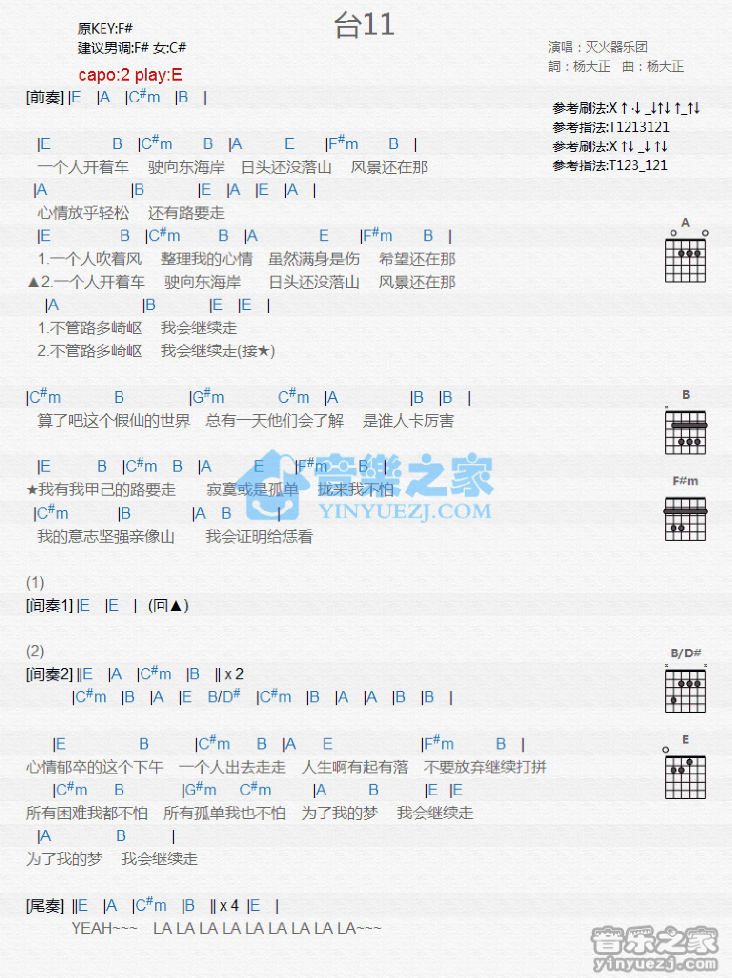 曲谱介绍: E调版灭火器《台11》吉他和弦弹唱谱