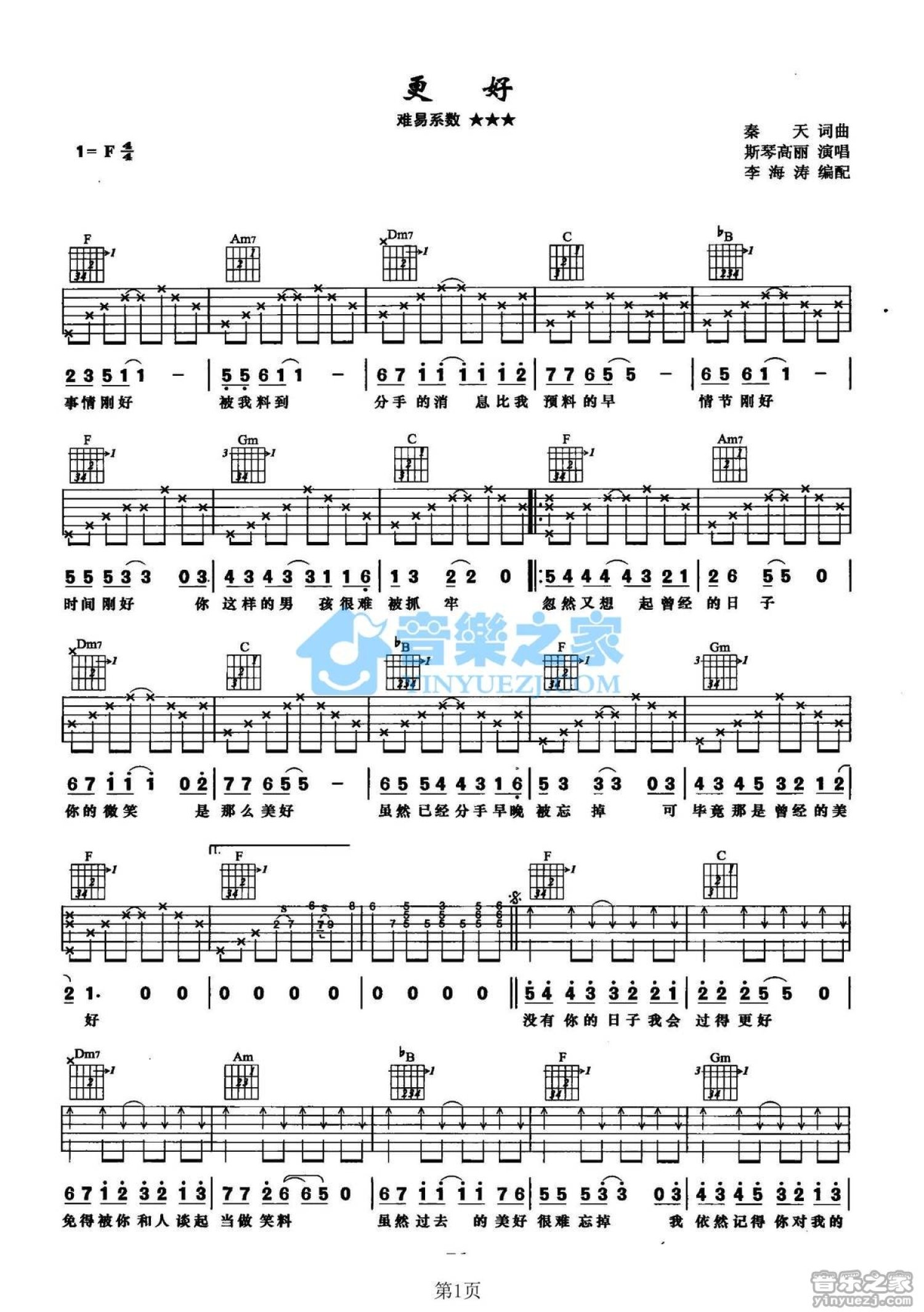 曲谱介绍: F调版斯琴高丽《更好》吉他弹唱六线谱