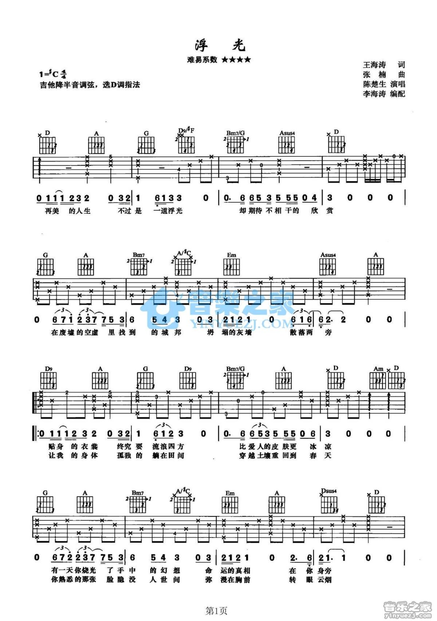 曲谱介绍: D调版陈楚生《浮光》吉他弹唱六线谱