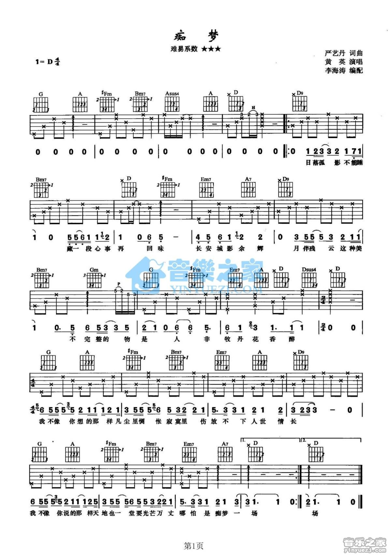 曲谱介绍: D调版黄英《痴梦》吉他弹唱六线谱