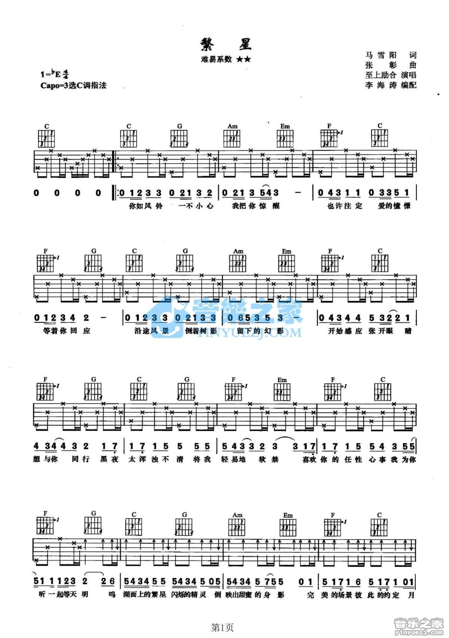 曲谱介绍: C调版至上励合《繁星》吉他弹唱六线谱