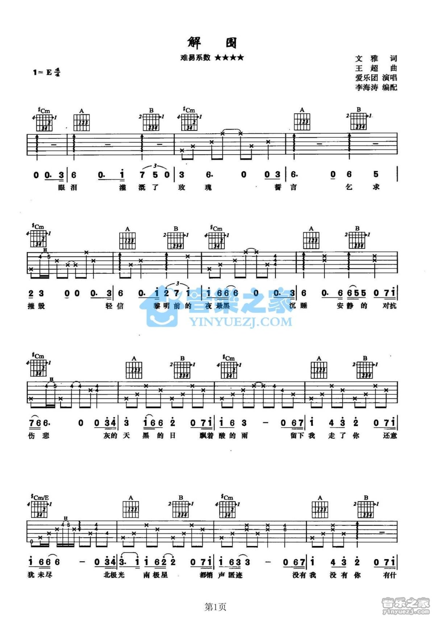 曲谱介绍: E调版爱乐团《解围》吉他弹唱六线谱