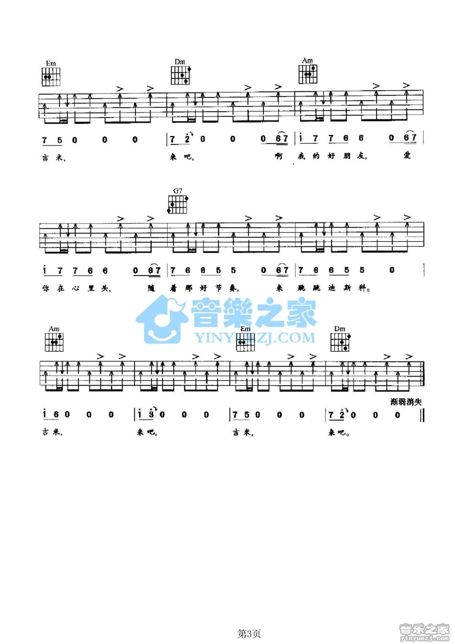 曲谱介绍: C调版《来吧吉米》吉他弹唱六线谱