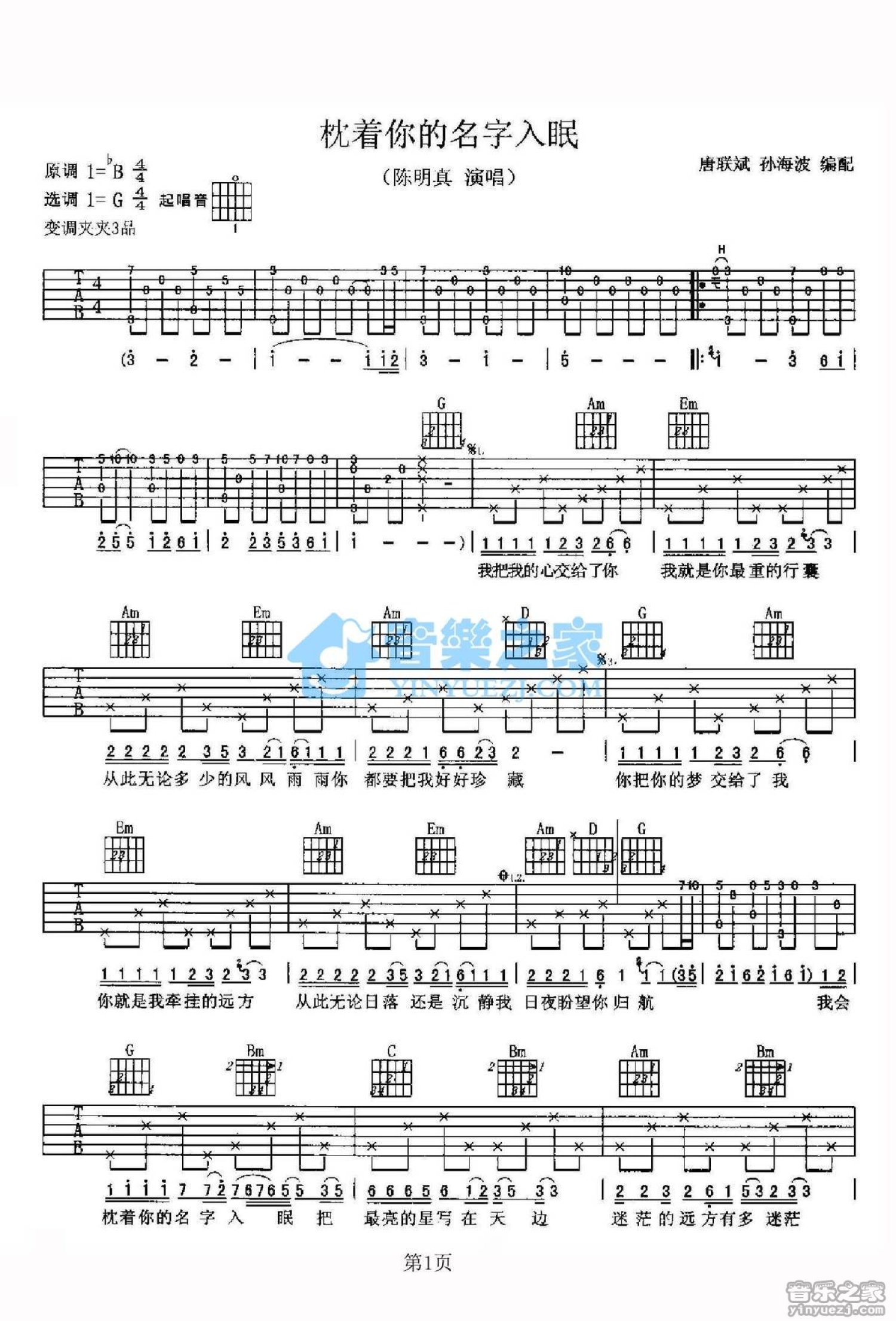 曲谱介绍: G调版陈明真《枕着你的名字入眠》吉他弹唱六线谱