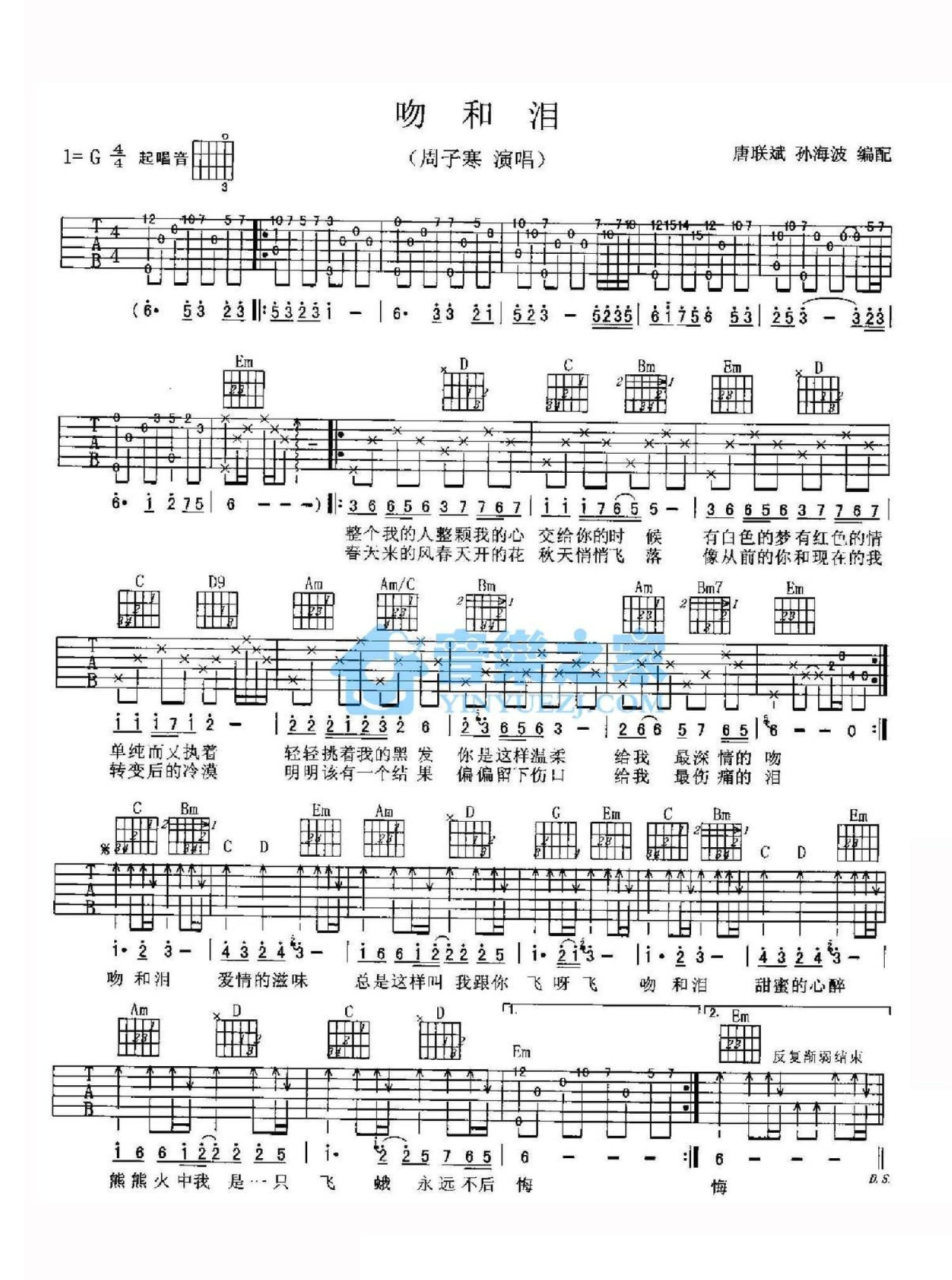 曲谱介绍: G调版周子寒《吻和泪》吉他弹唱六线谱