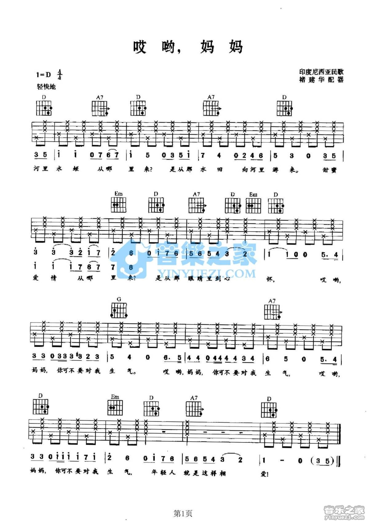 哎呦妈妈吉他谱 - 印尼民歌 - D调吉他弹唱谱