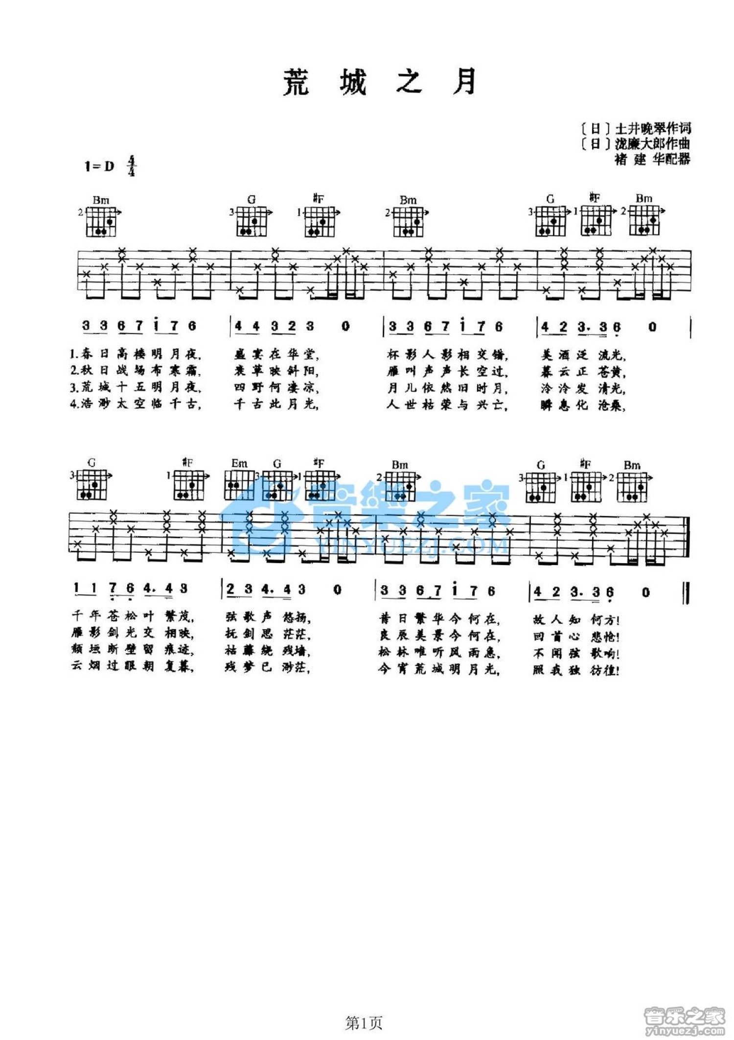 曲谱介绍: D调版日本民歌《荒城之月》吉他弹唱六线谱