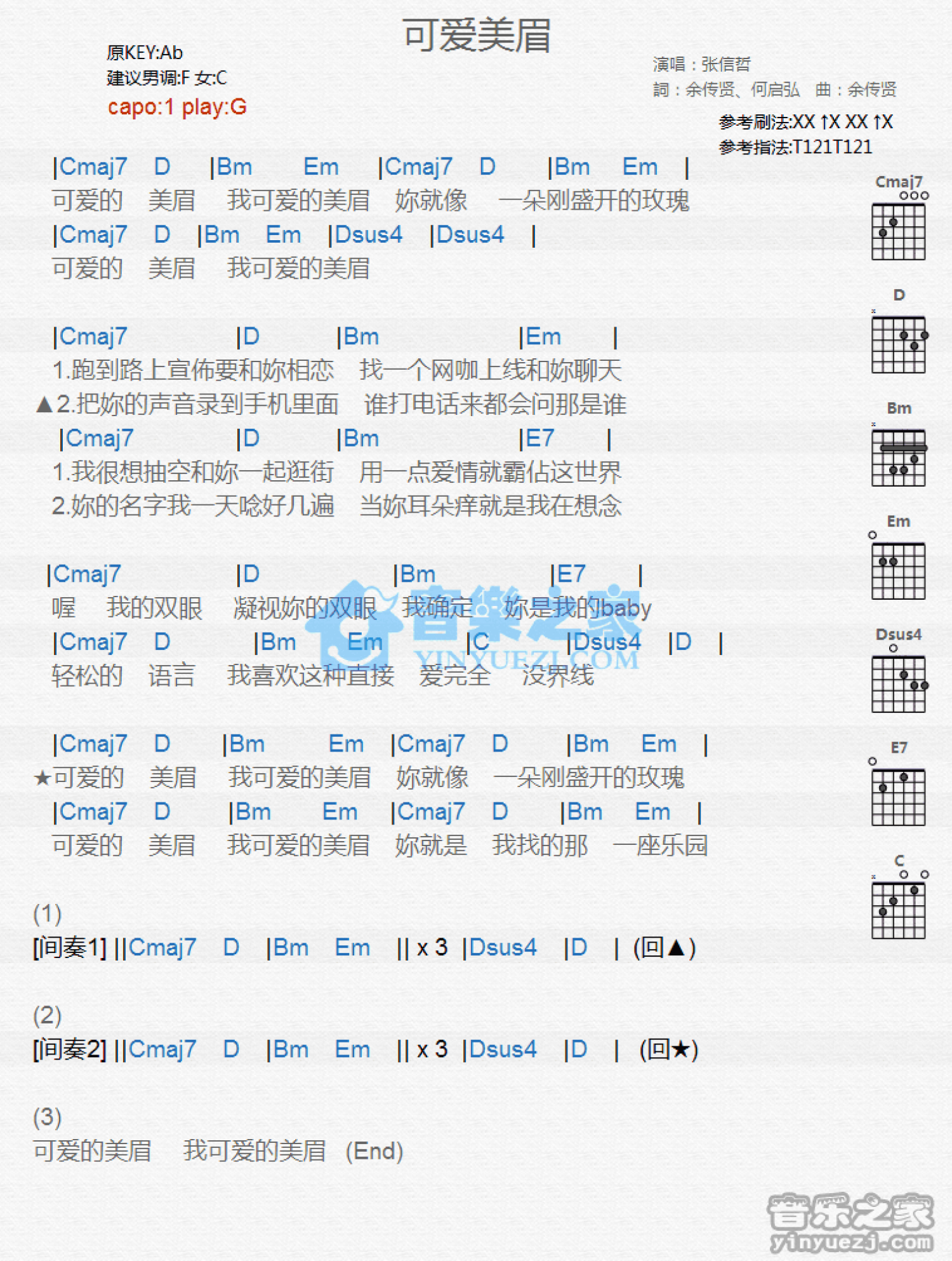曲谱介绍: G调版张信哲《可爱美眉》吉他和弦弹唱谱