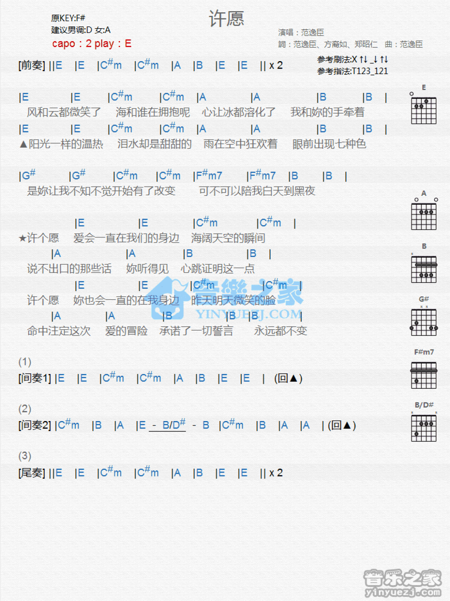 曲谱介绍: E调版范逸臣《许愿》吉他和弦弹唱谱