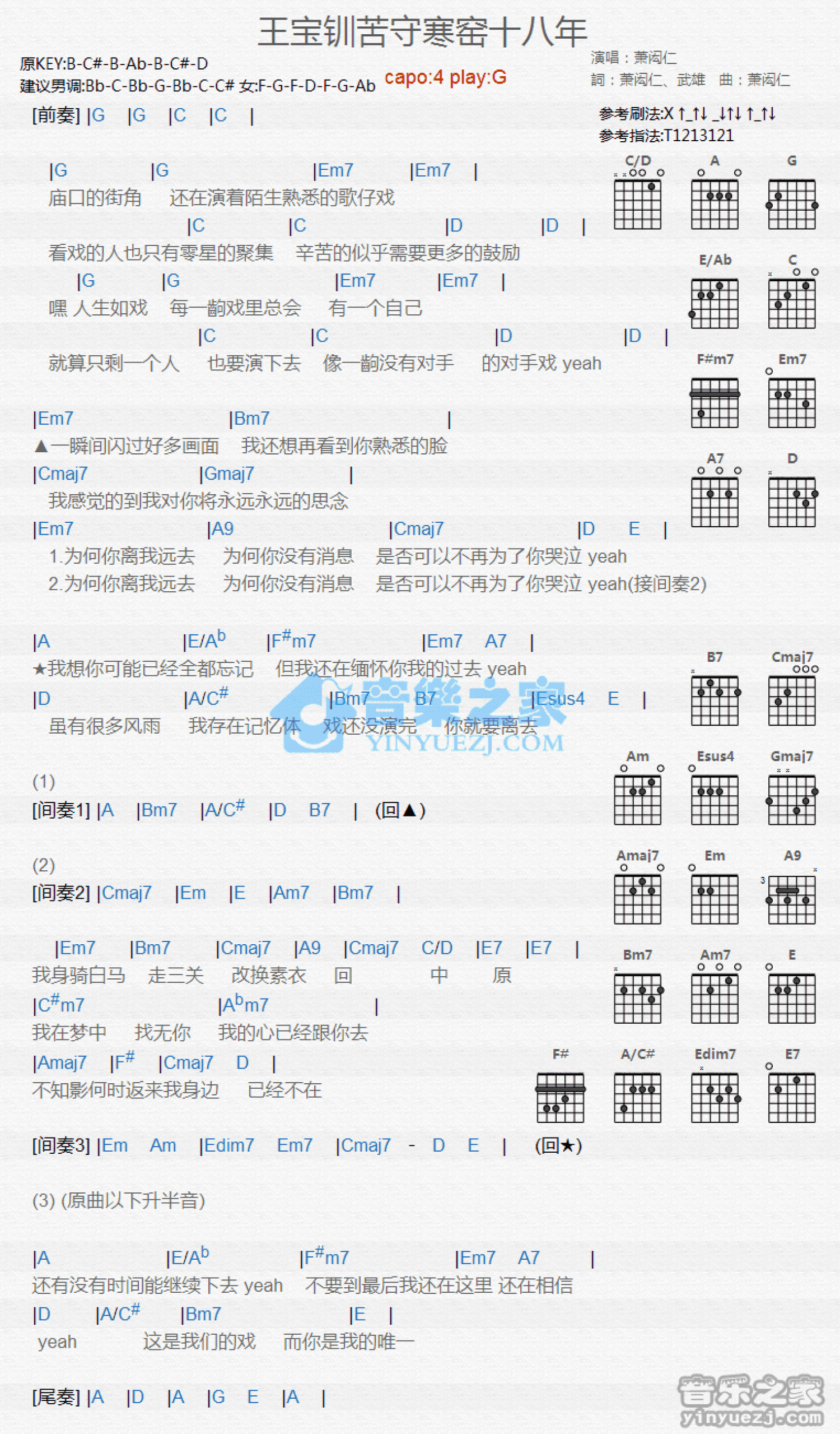 曲谱介绍: G调版萧闳仁《王宝钏苦守寒窑十八年》吉他和弦弹唱谱
