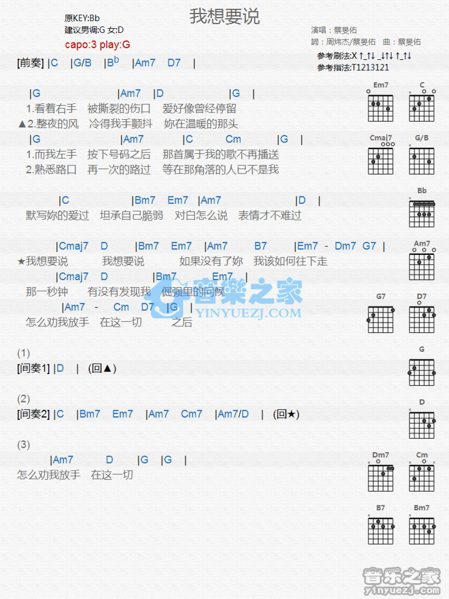 曲谱介绍: G调版蔡F佑《我想要说》吉他和弦弹唱谱