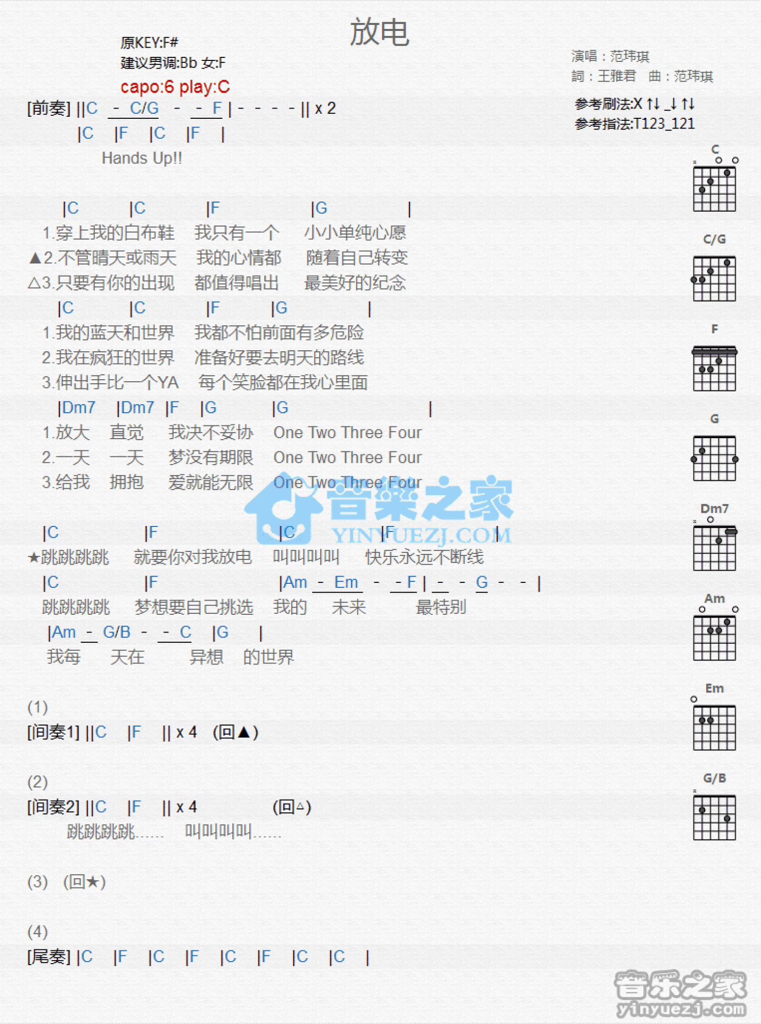 曲谱介绍: C调版范玮琪《放电》吉他和弦弹唱谱