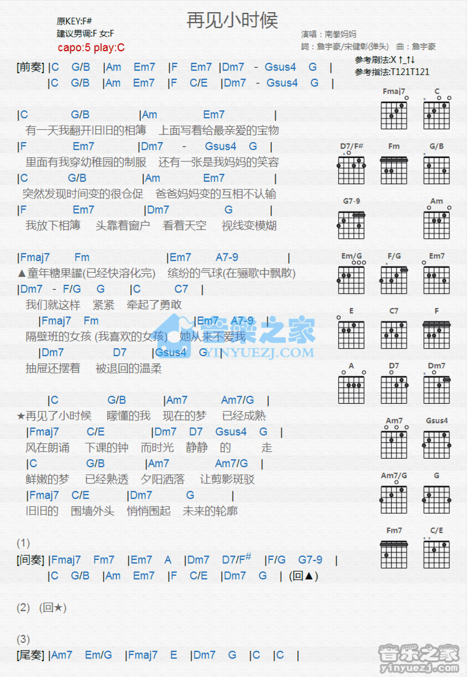 曲谱介绍: C调版 南拳妈妈《再见小时候》吉他和弦弹唱谱