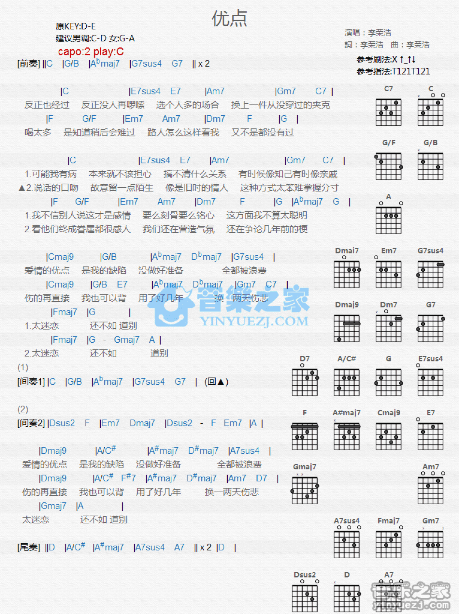 曲谱介绍: C调版李荣浩《优点》吉他和弦弹唱谱
