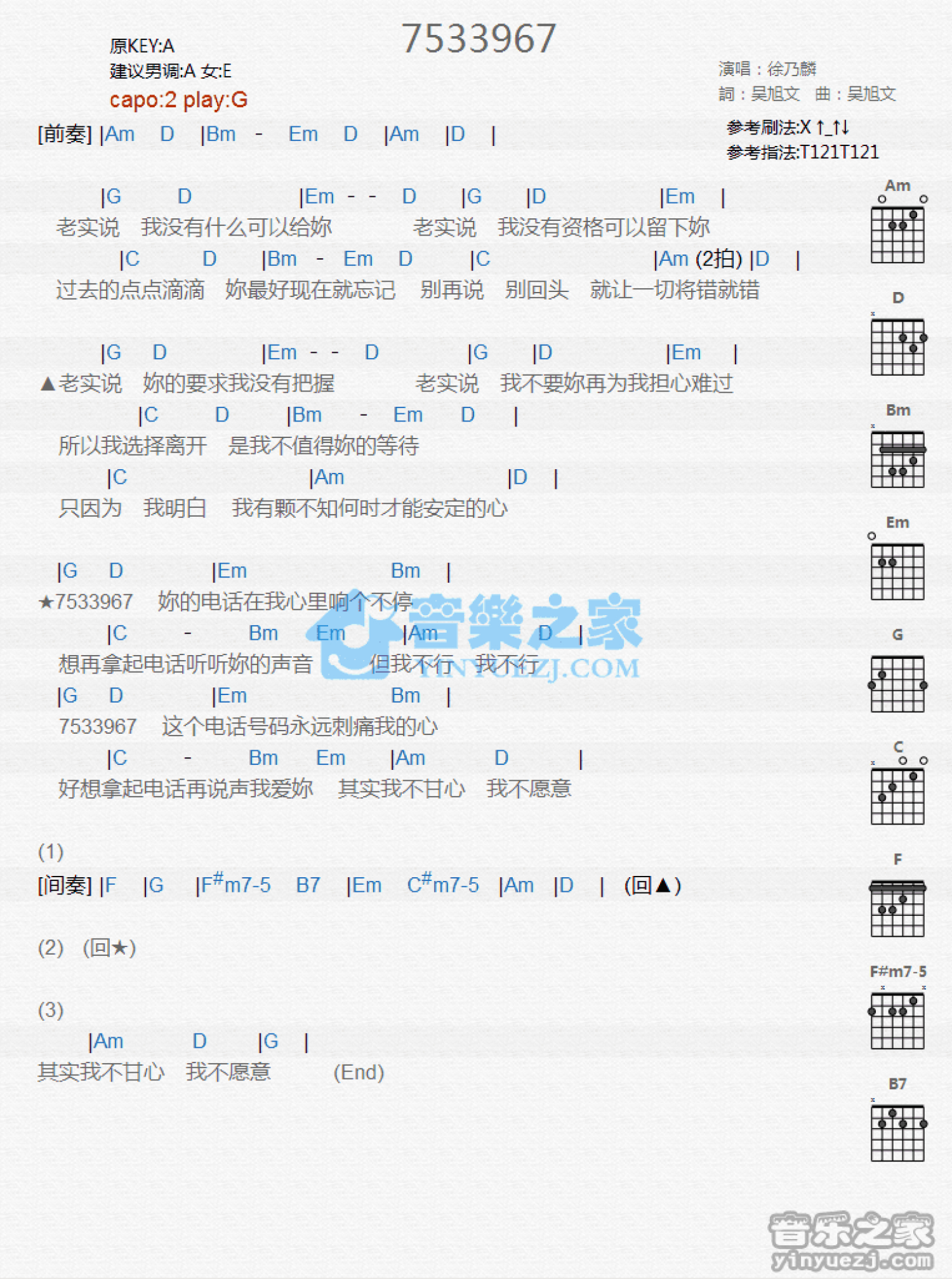 曲谱介绍: G调版徐乃麟《7533967》吉他和弦弹唱谱