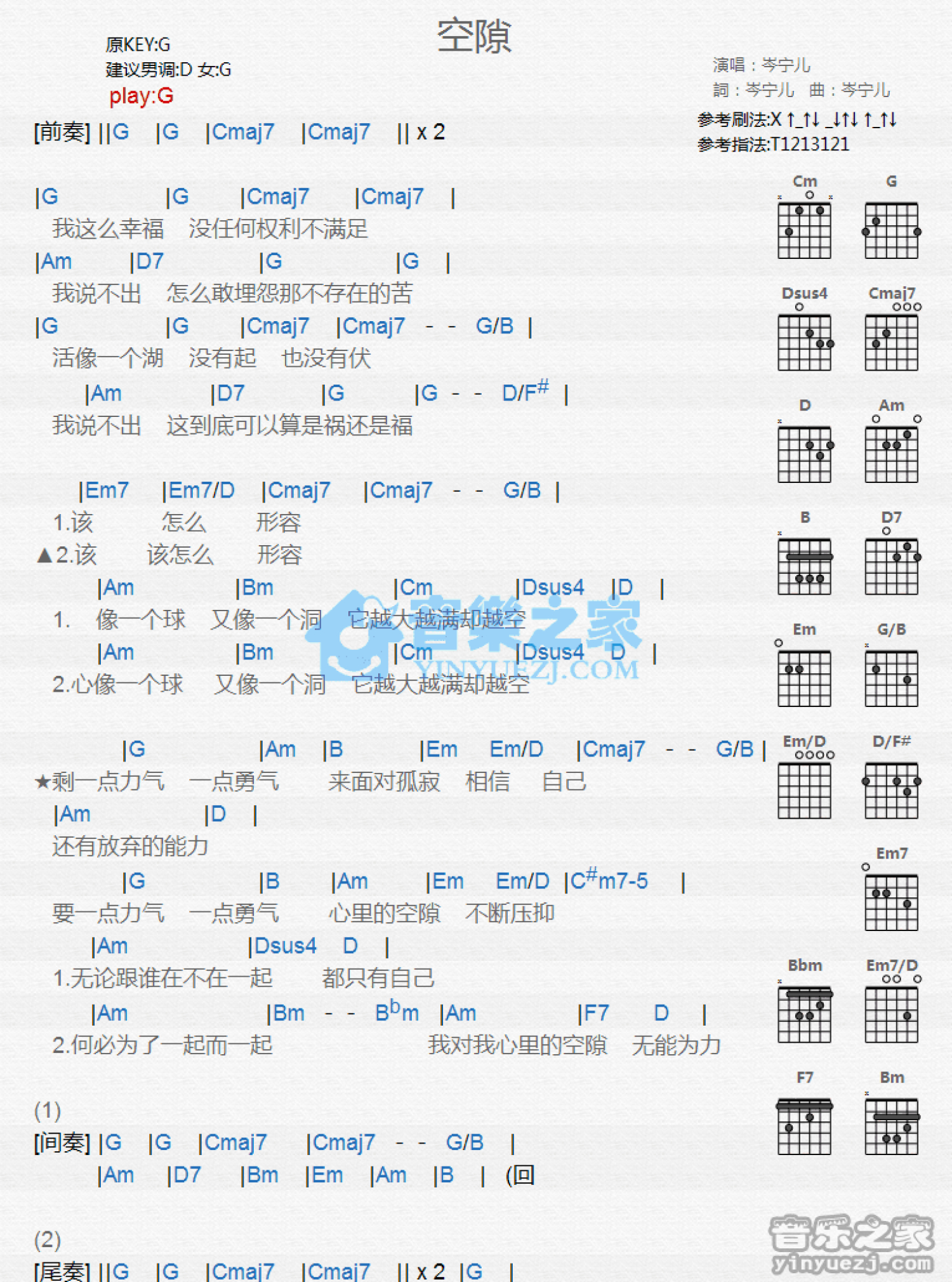 曲谱介绍: G调版岑宁儿《空隙》吉他和弦弹唱谱