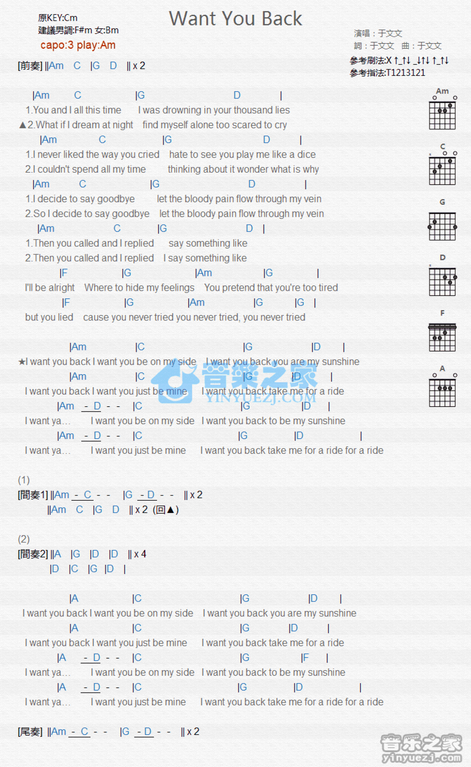 曲谱介绍: Am调版于文文《wantyouback》吉他和弦弹唱谱
