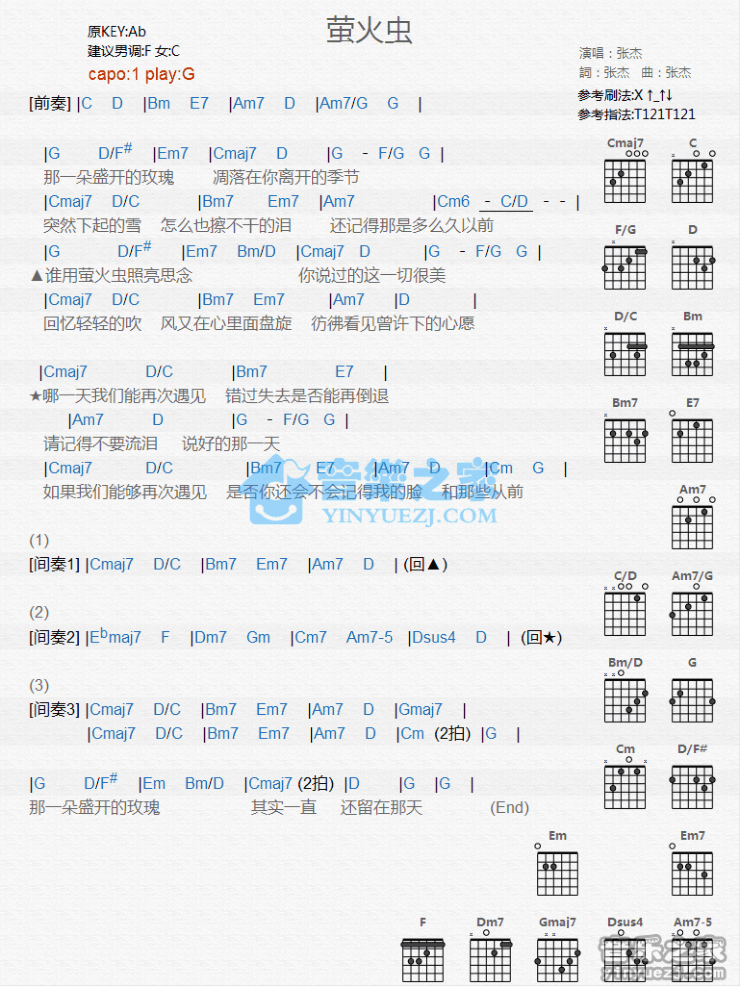 曲谱介绍: G调版《萤火虫》吉他和弦弹唱谱