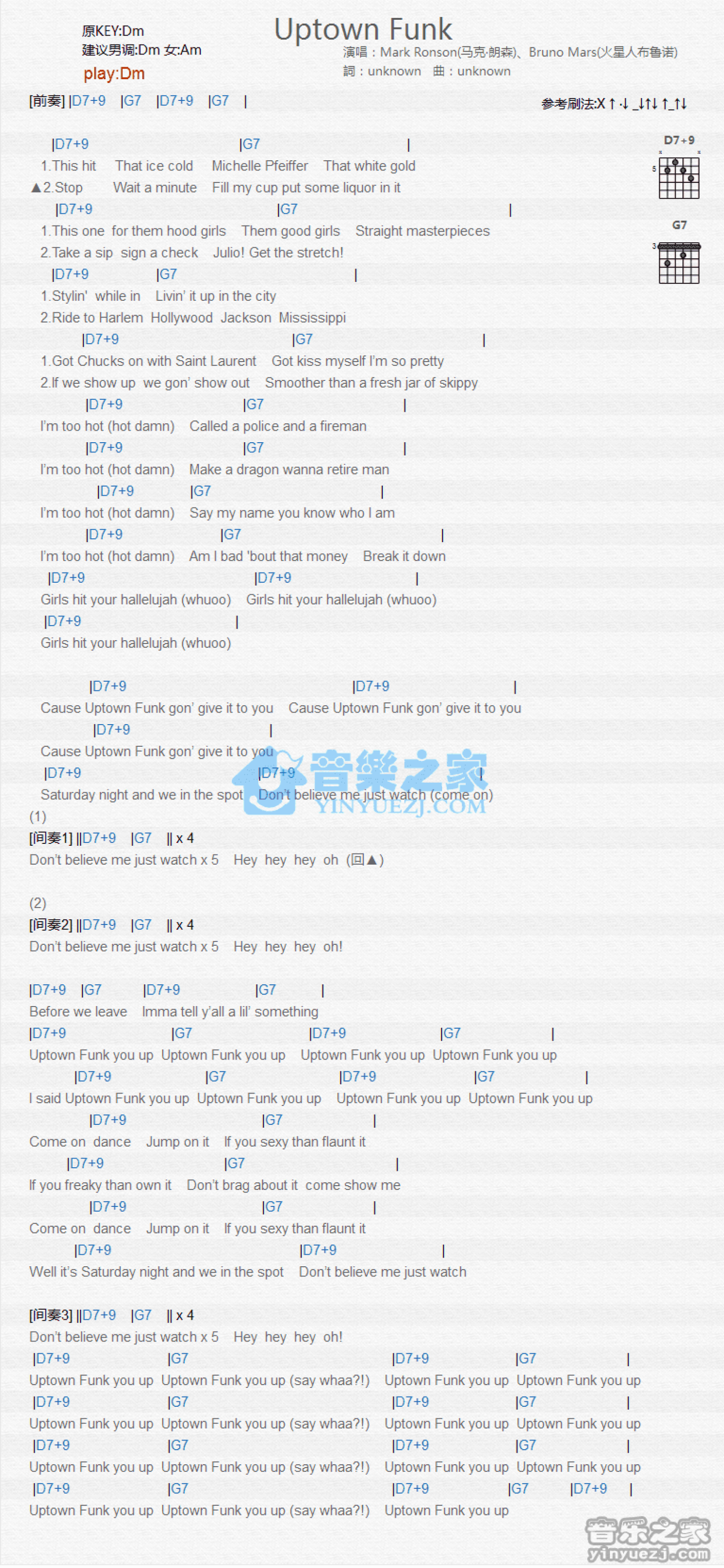 曲谱介绍: Dm调版 Mark Ronson《Uptown Funk》吉他和弦弹唱谱
