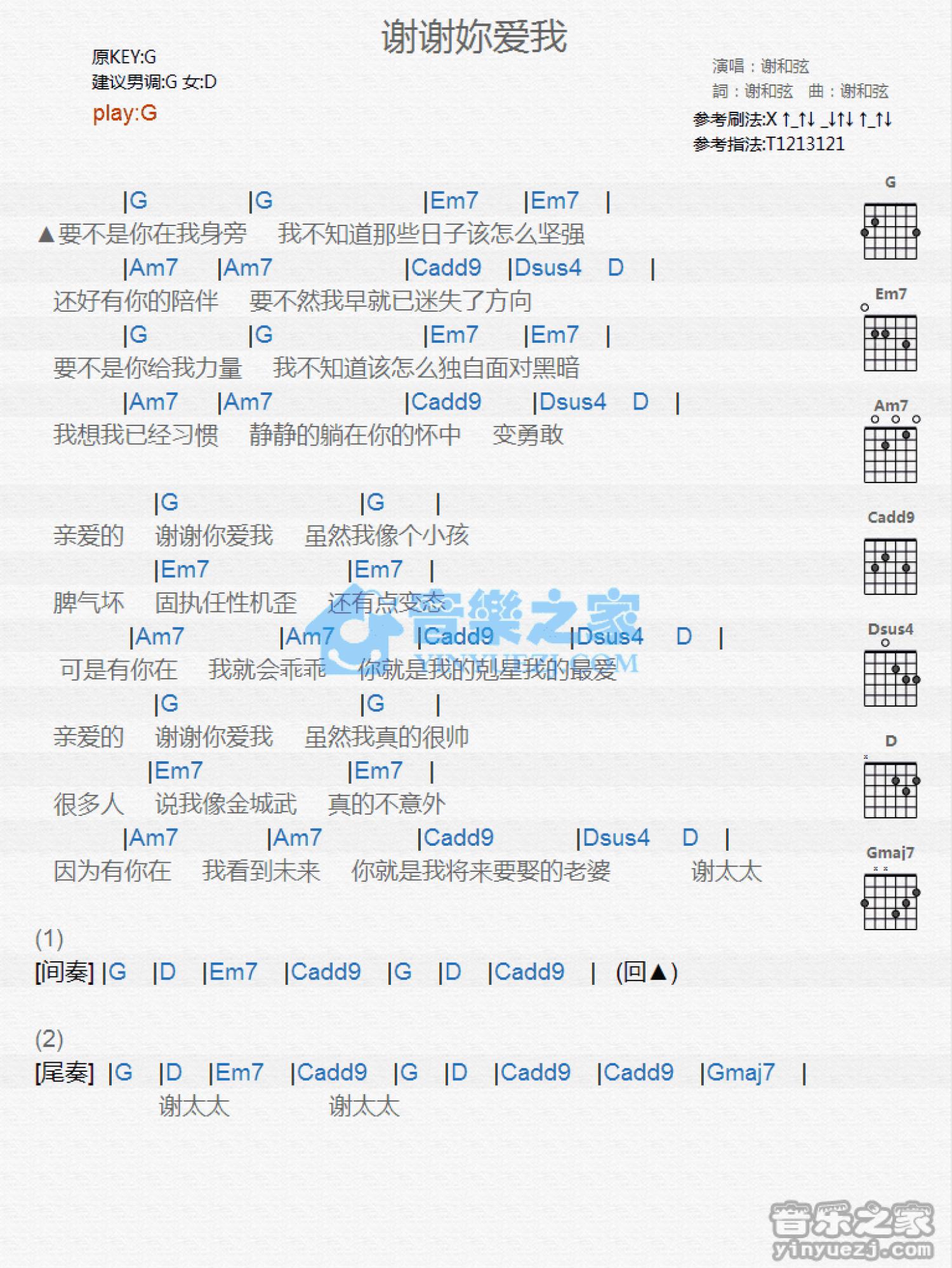 曲谱介绍: G调版《谢谢你爱我》吉他和弦弹唱谱