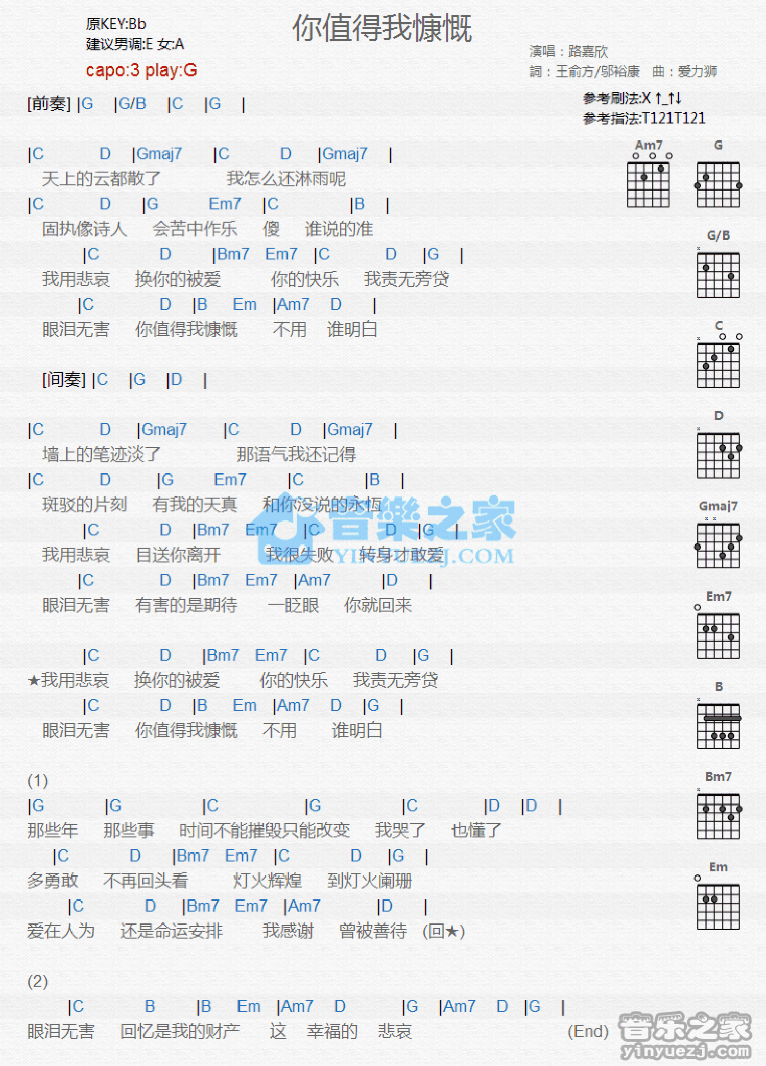 曲谱介绍: G调版 路嘉欣《你值得我慷慨》吉他和弦弹唱谱