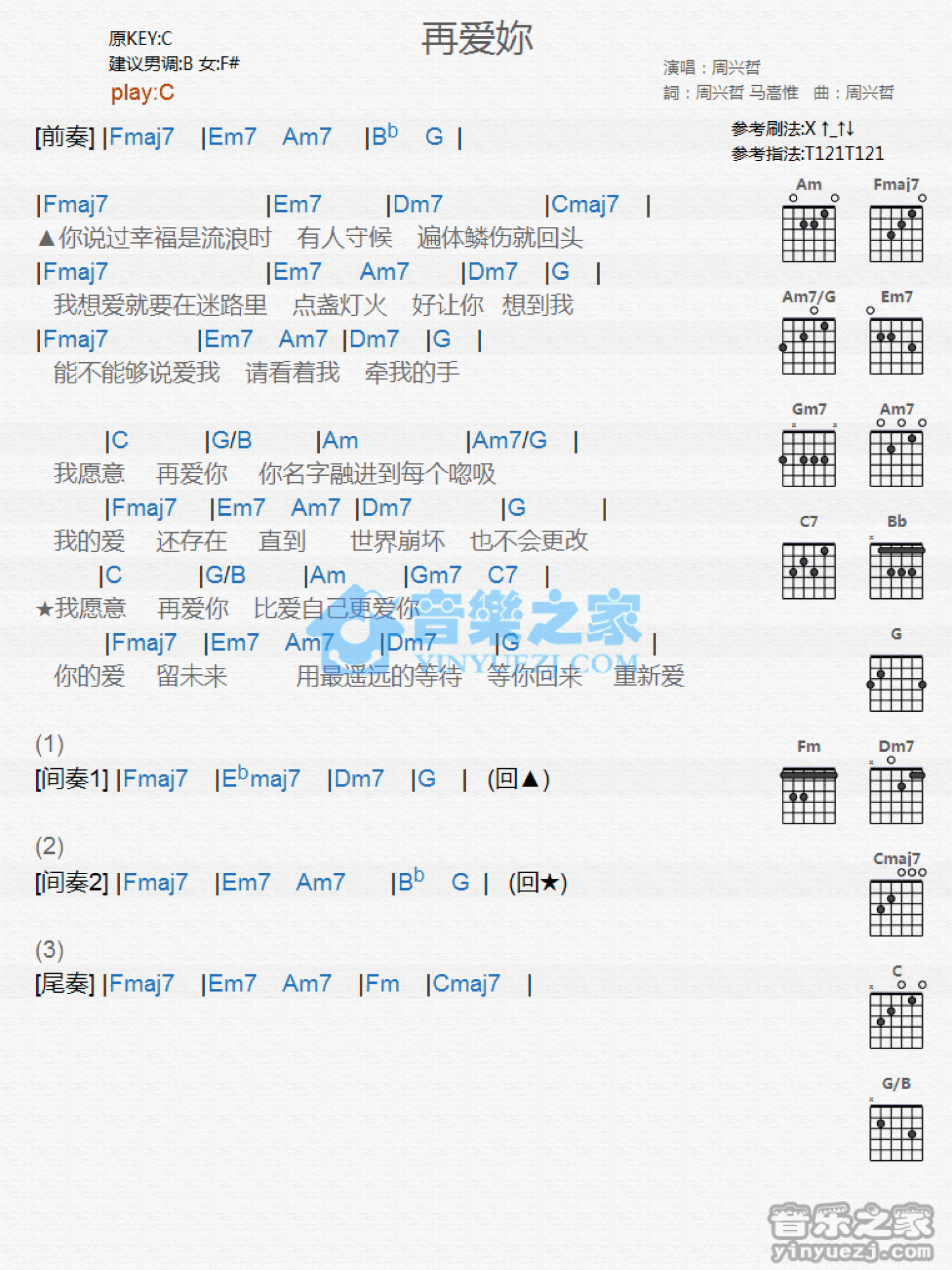 曲谱介绍: C调版周兴哲《再爱你》吉他和弦弹唱谱