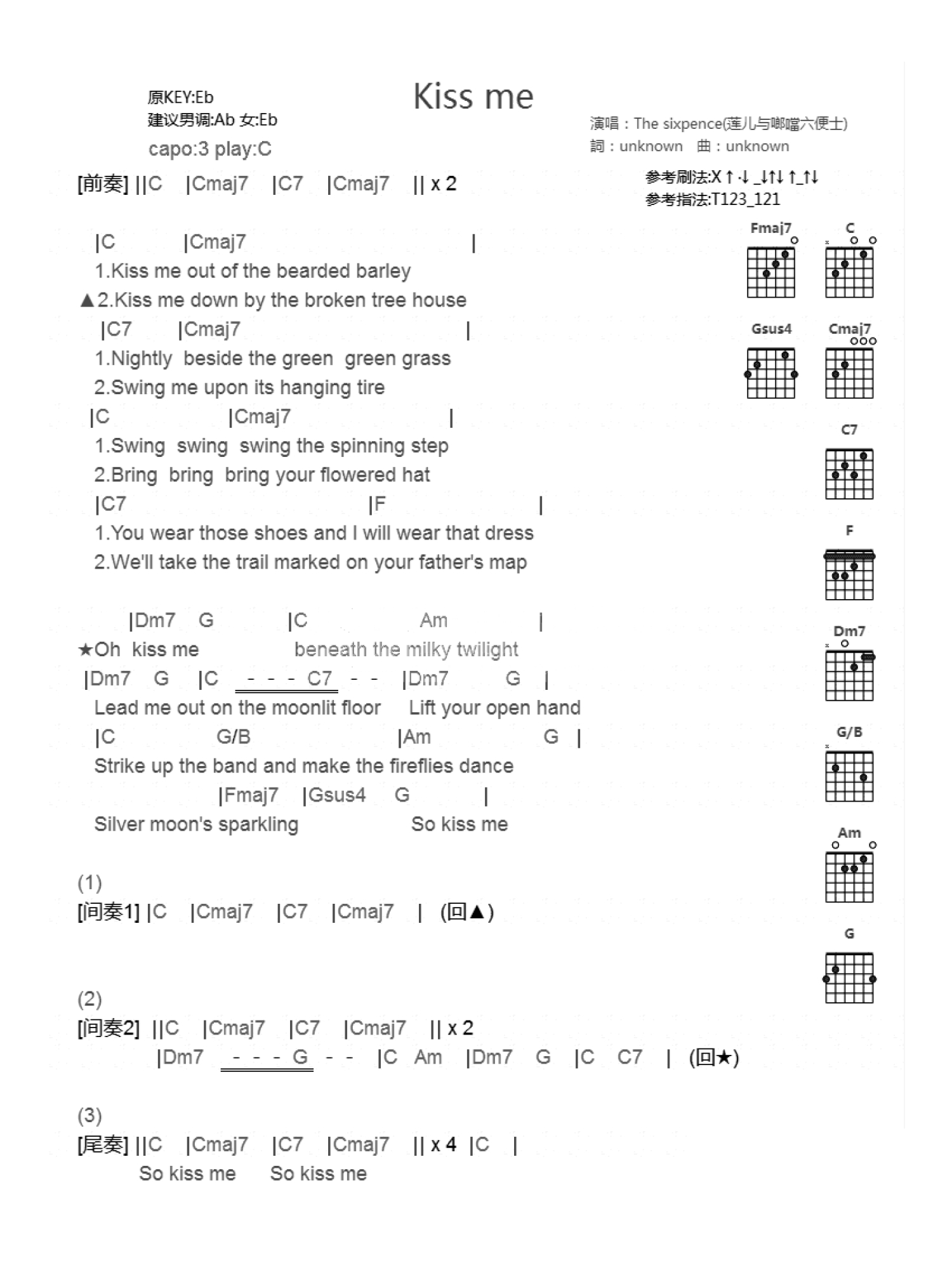 曲谱介绍: C调版《KissMe》吉他和弦弹唱谱
