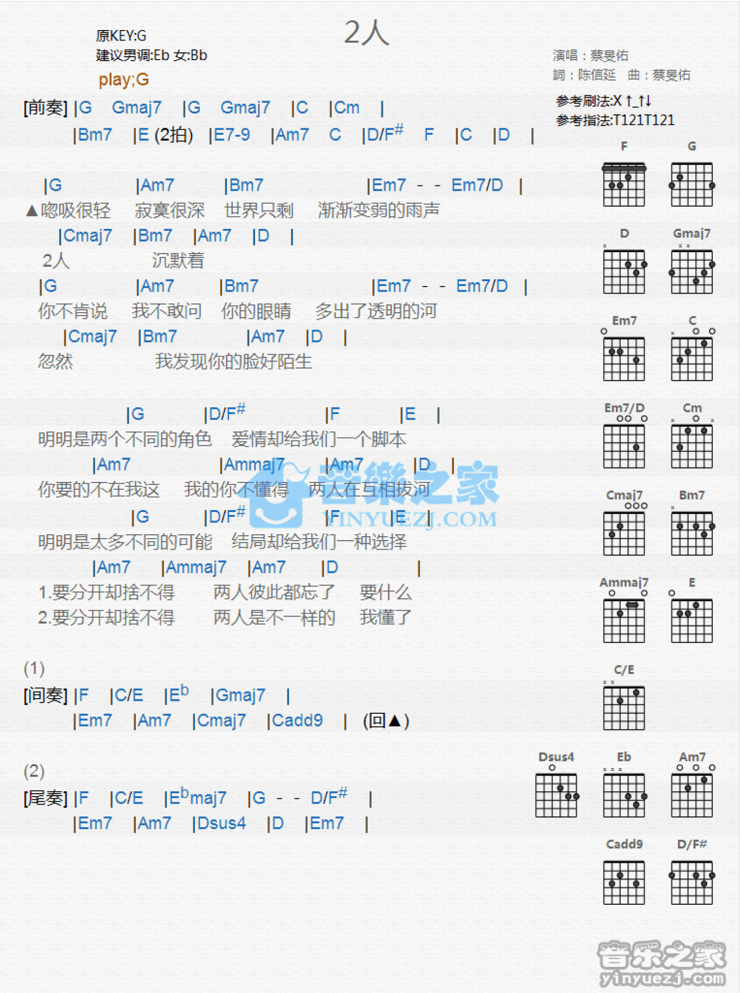 曲谱介绍: G调版蔡F佑《2人》吉他和弦弹唱谱