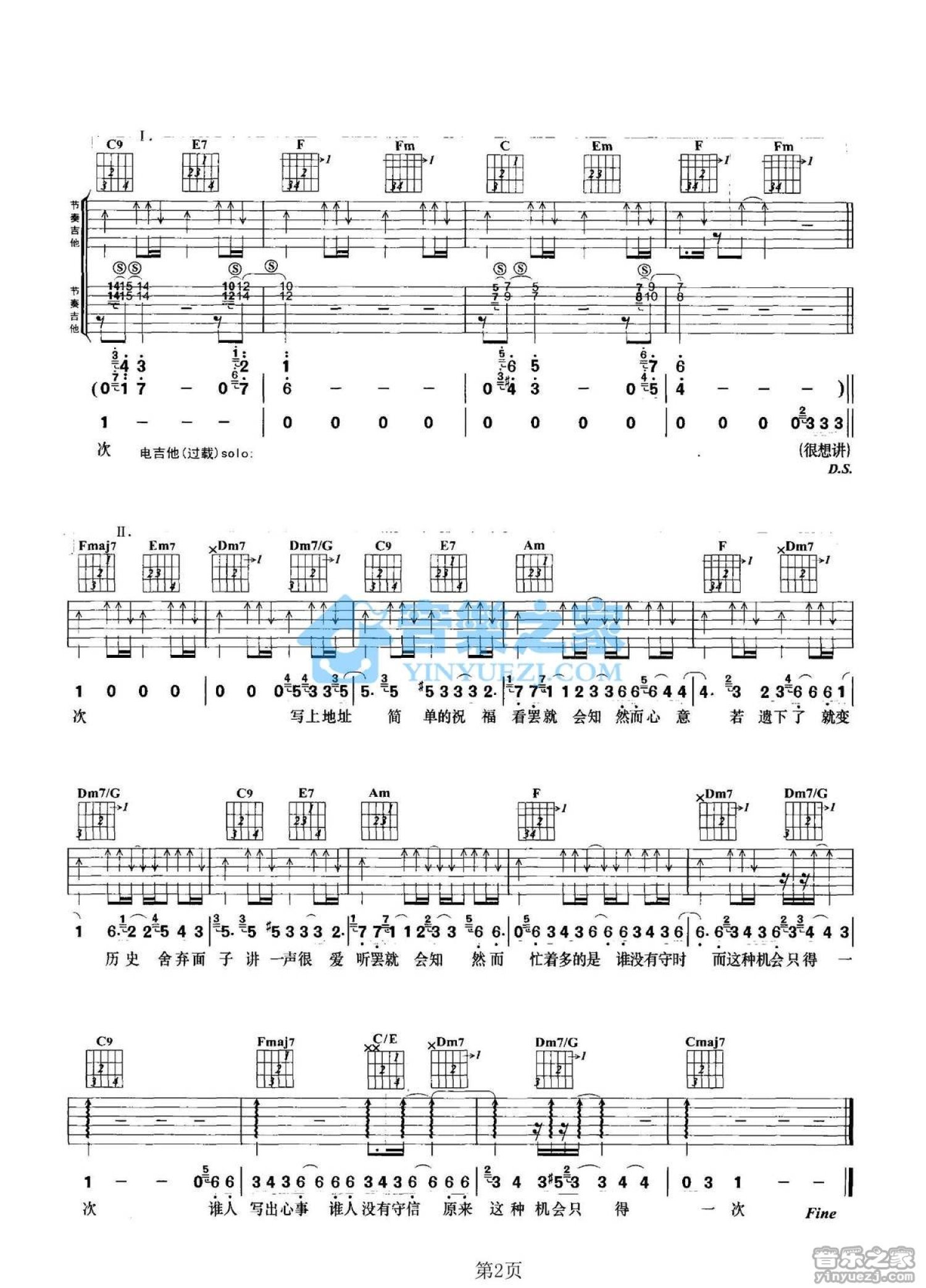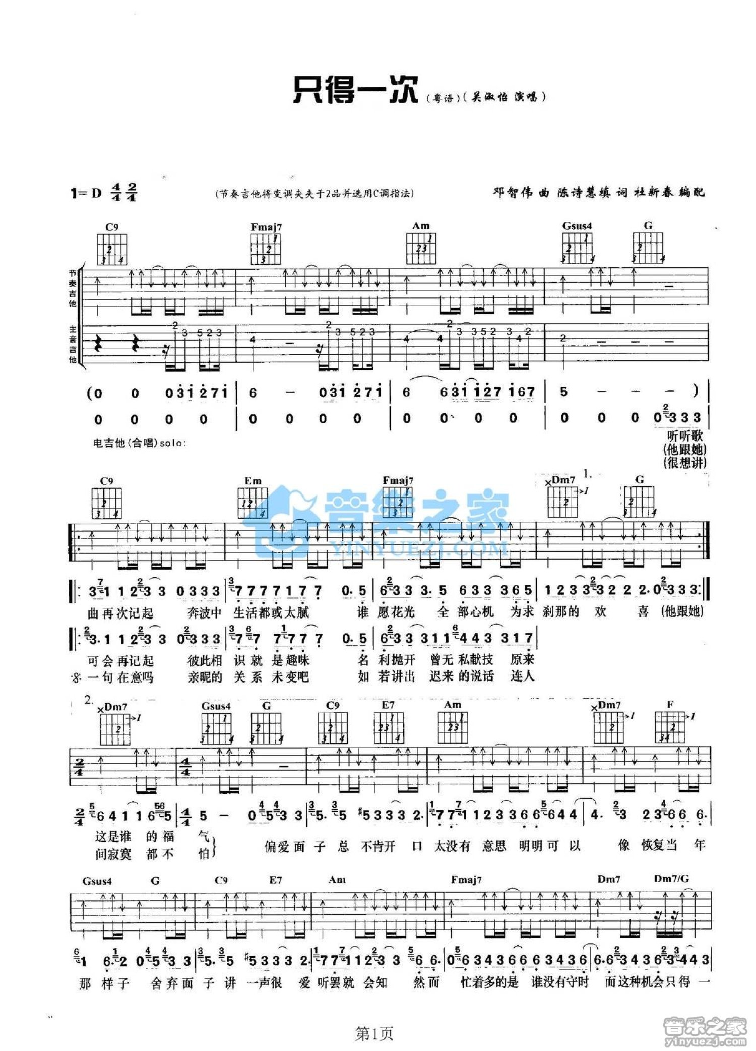 曲谱介绍: C调双吉他版关淑怡《只得一次》吉他弹唱六线谱