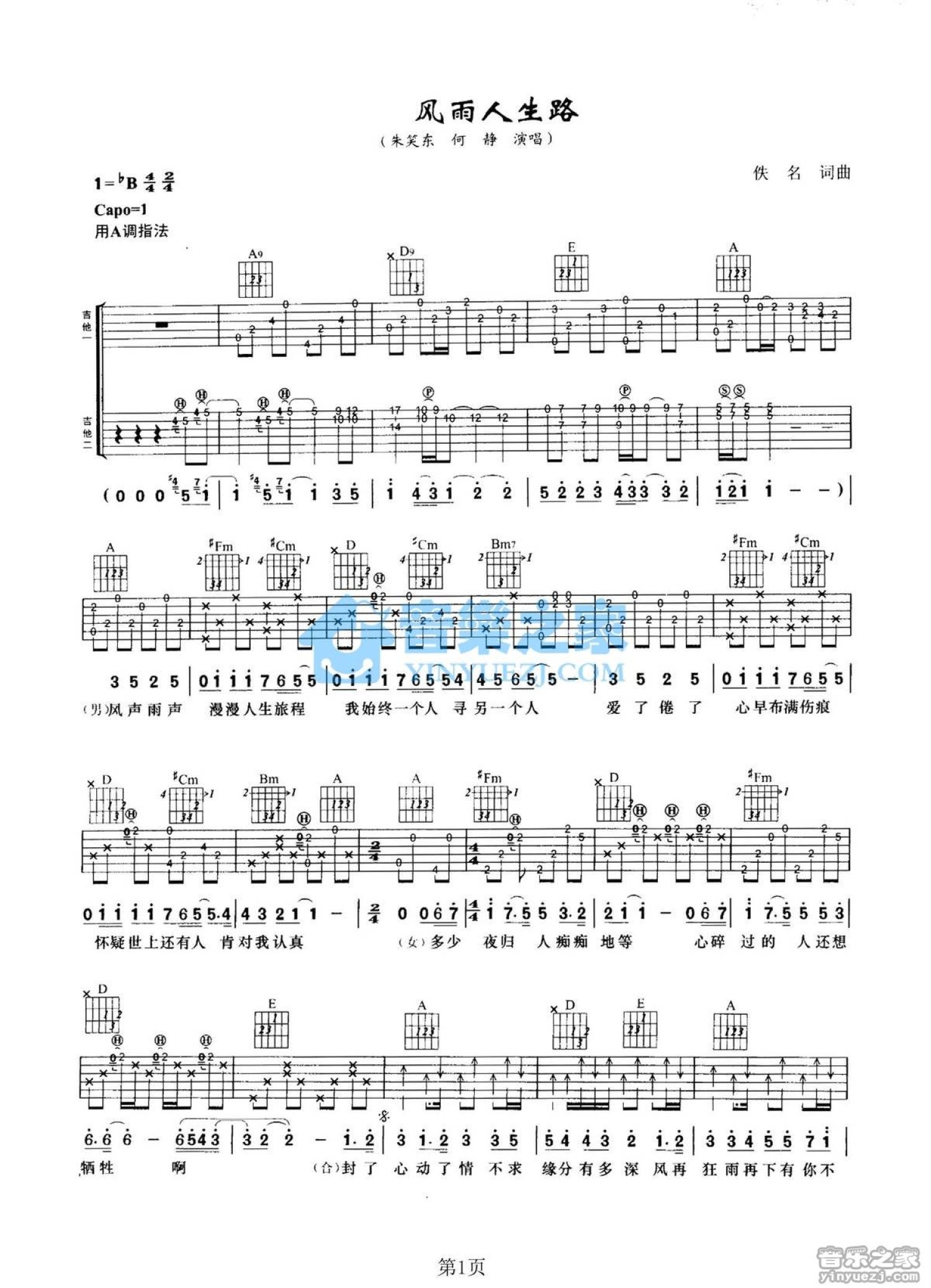 曲谱介绍: A调双吉他版朱笑东/何静《风雨人生路》吉他弹唱六线谱