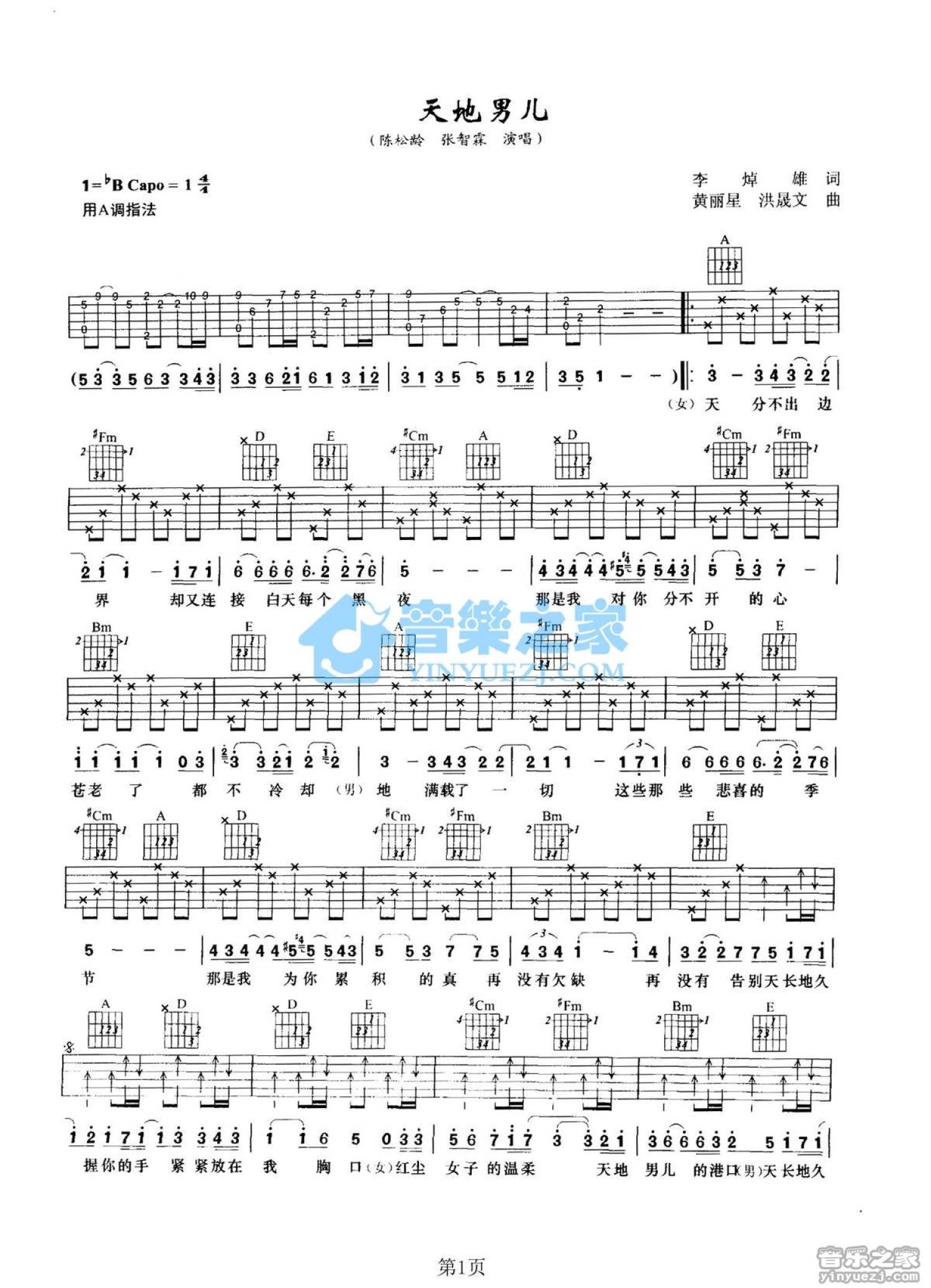 曲谱介绍: A调版陈松龄/张智霖《天地男儿》吉他弹唱六线谱
