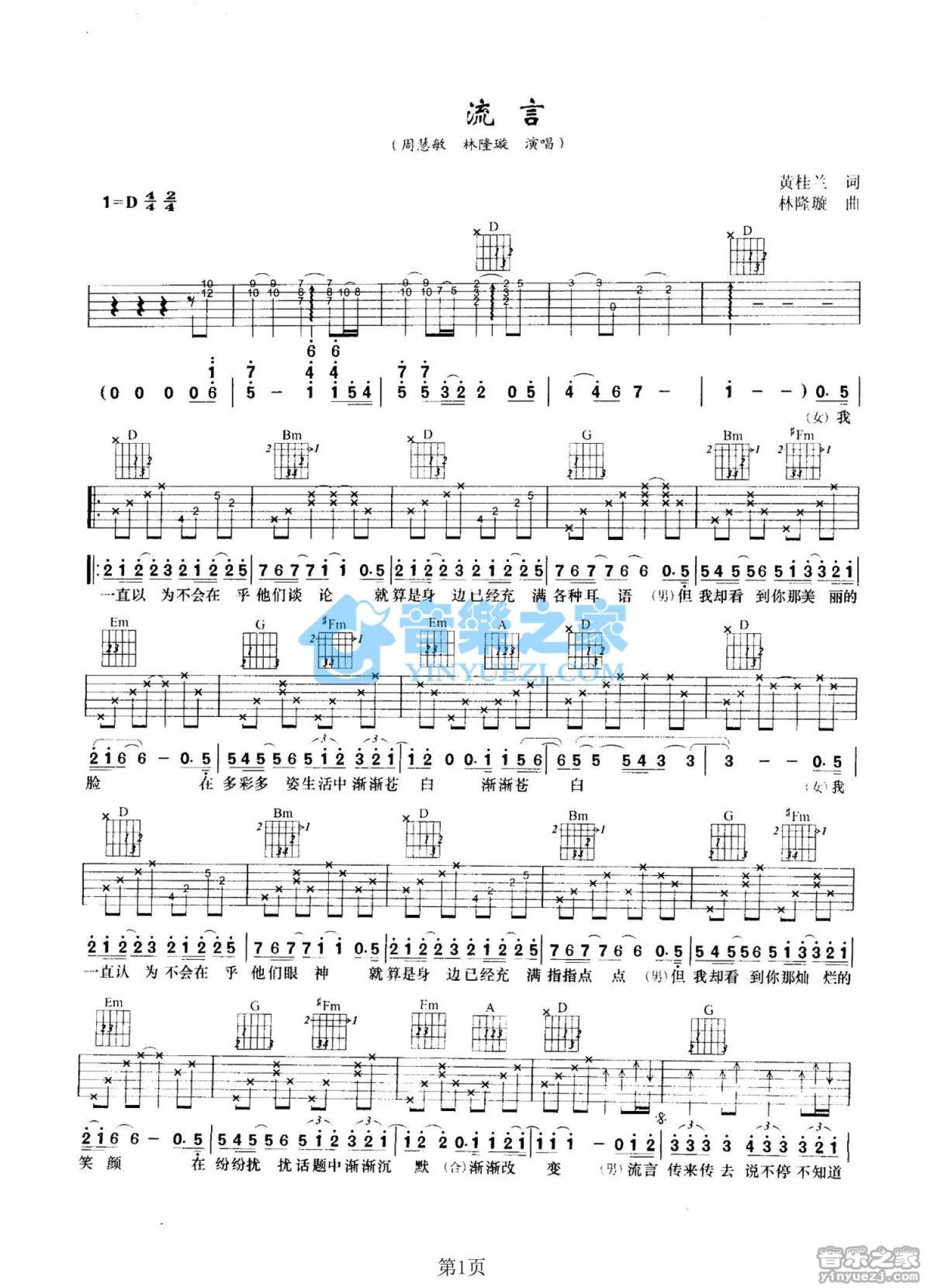 曲谱介绍: D调版周慧敏/林隆璇《流言》吉他弹唱六线谱
