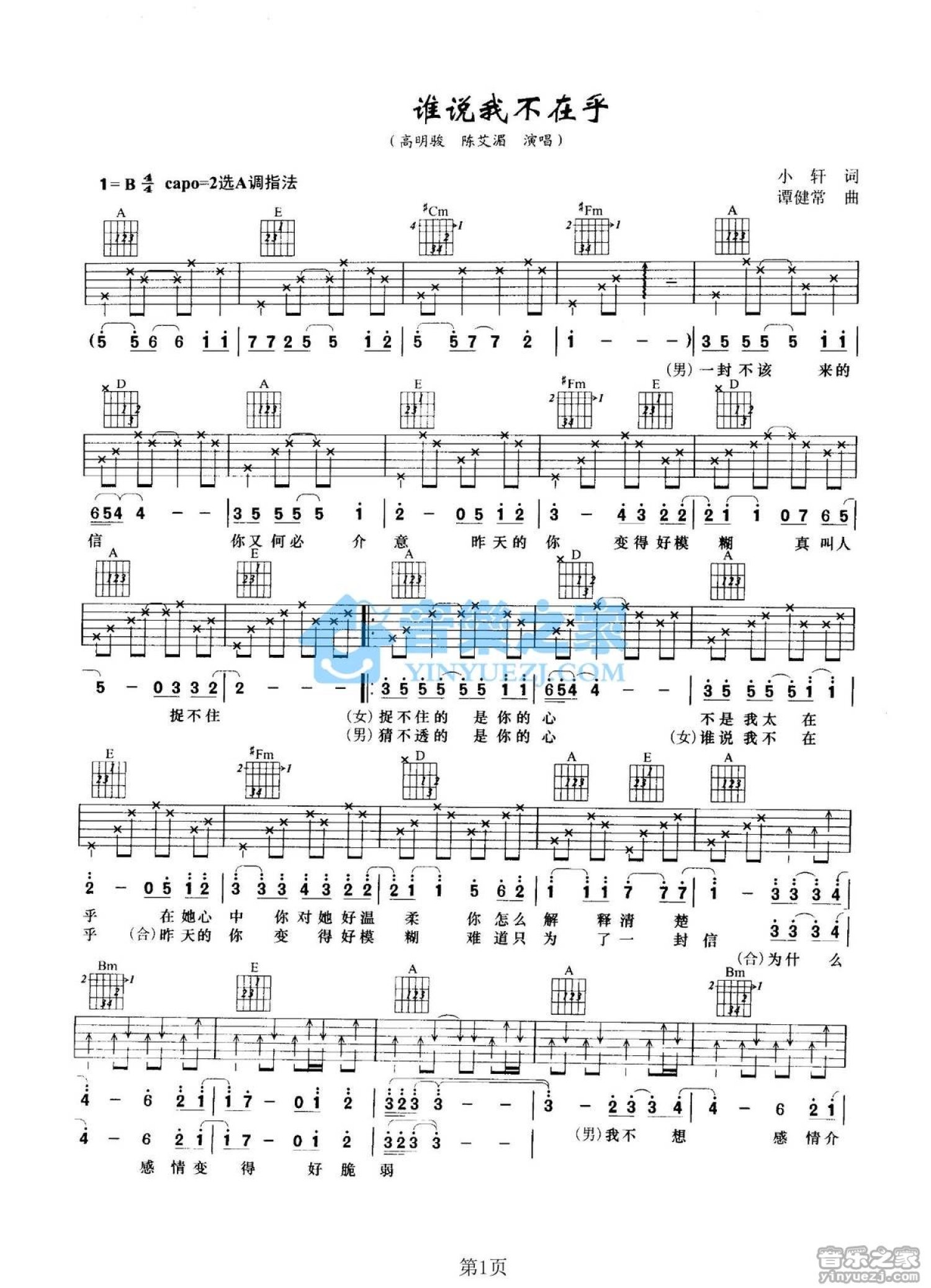 曲谱介绍: A调版《谁说我不在乎》吉他弹唱六线谱