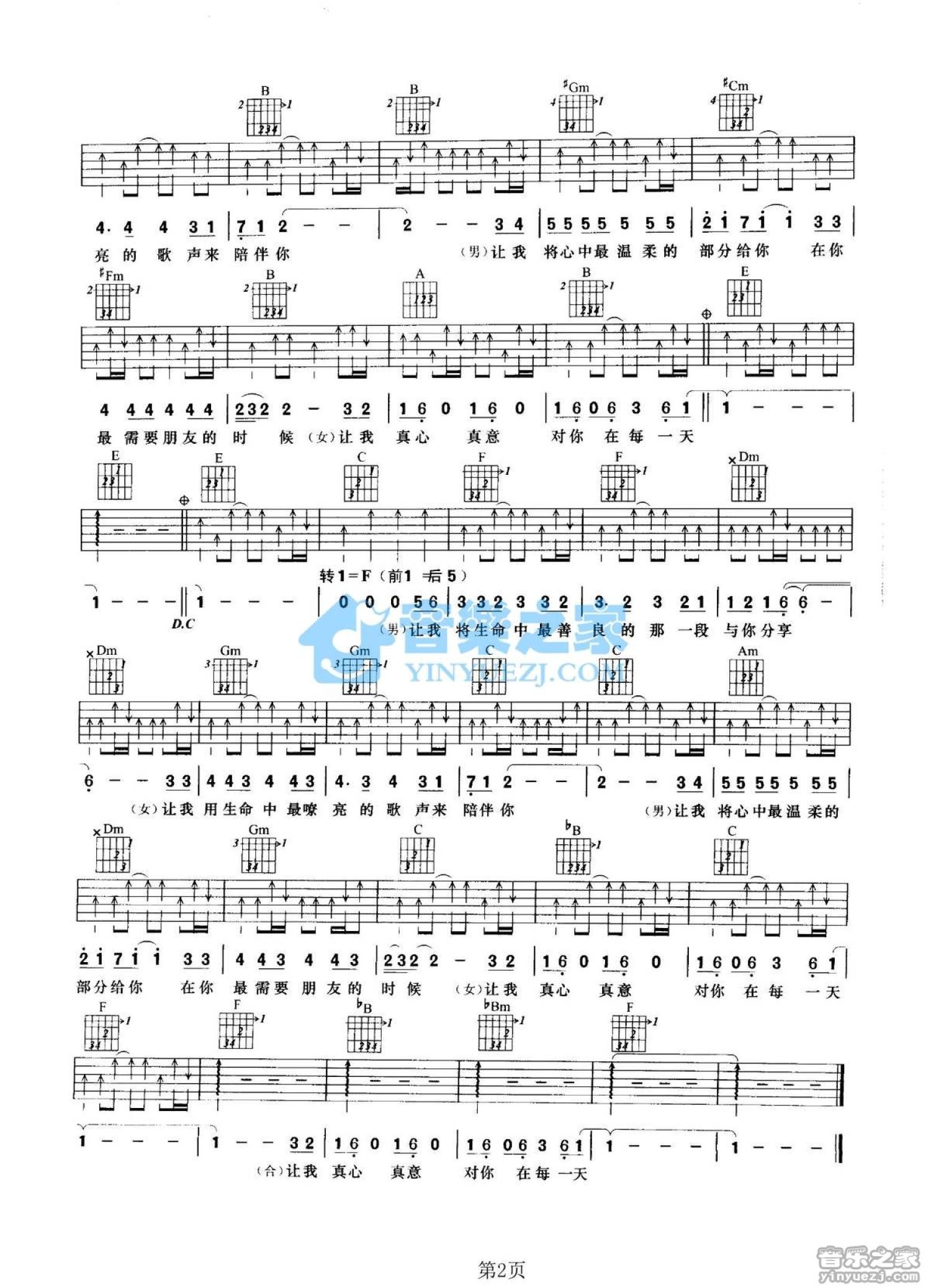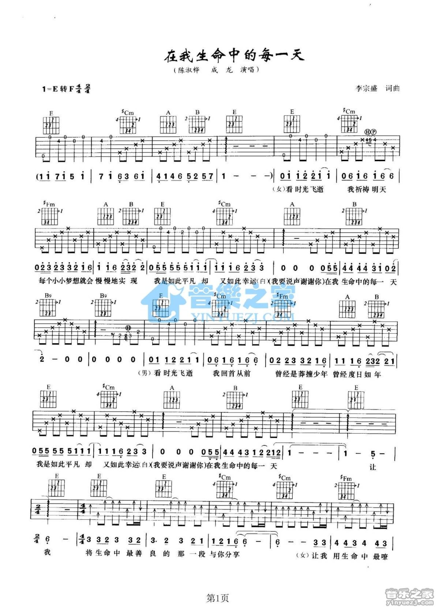 曲谱介绍: E转F调版成龙/陈淑桦《在我生命中的每一天》吉他弹唱六线谱